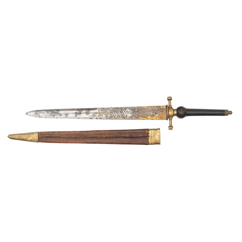 11.25" blade. 17.5" overall with scabbard. Single edge spear point blade with a 5.75" false edge. Hilt appears to be made of horn and has brass fittings, including a guard with a flathead and octagonal tool quillons. Blade is etched with a boar on one side and stag on obverse side, surrounded by floral work and gold plating. Includes a brown leather scabbard with brass fittings. Scabbard is marked From Waterloo to one side, but blade is most likely from the mid-18th century. Possibly Spanish or German.