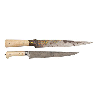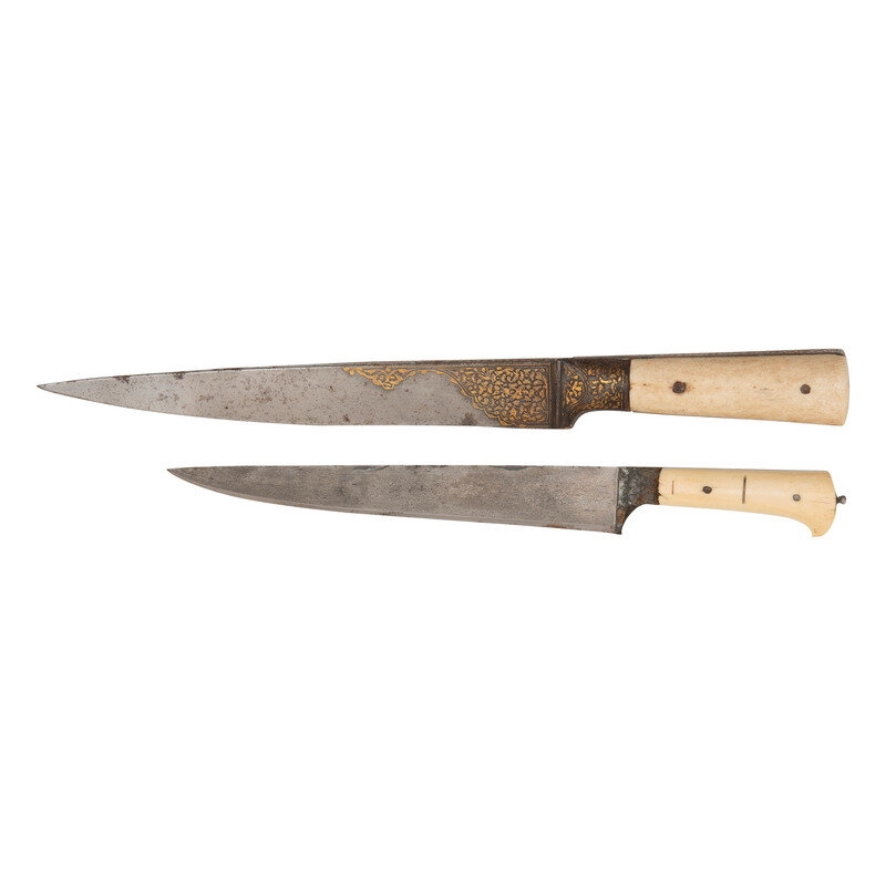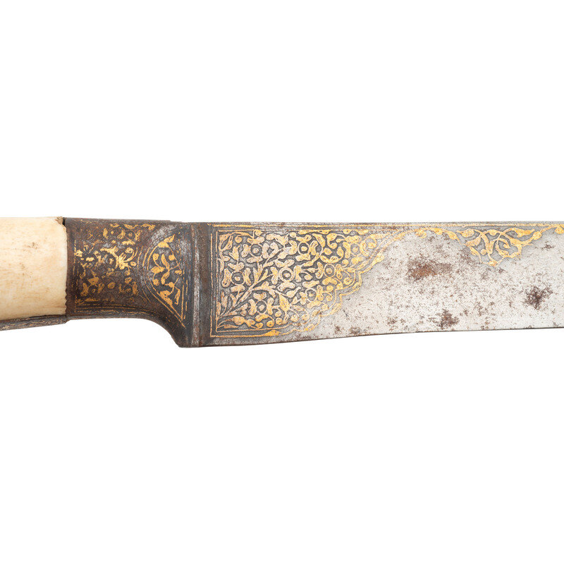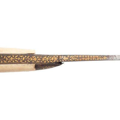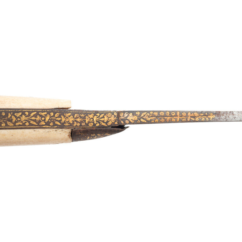 1.) 9.5" blade. 14.25" overall with hilt. Single edge straight point blade with gold koftgari work to both ricassos, spine of blade, and backstrap. Hilt appears to have ivory grip panels, with gold koftgari decorated bolsters. Bolster(s) appear to have become detached at some point due to oxidation losses and are held in place with tape.