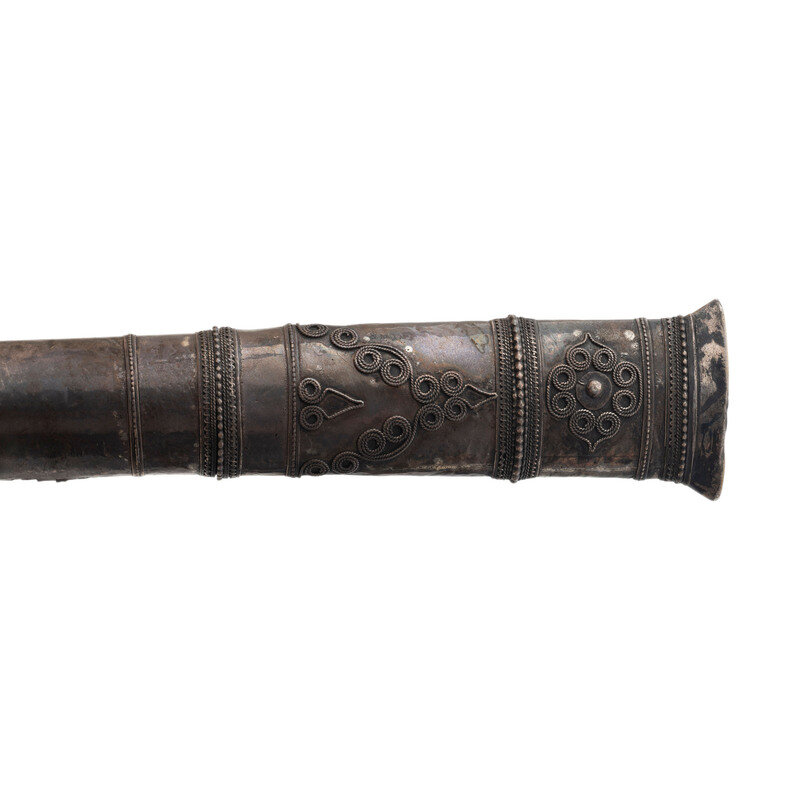 3.) 5" blade. 9.5" overall with hilt and sheath. Single edge straight point blade with a slightly concaved spine. Hilt is of ivory and features a silver collar with borderwork engravings. Sheath appears to be wood wrapped with sheets of silver that are decorated with braided silver wire and borderwork.