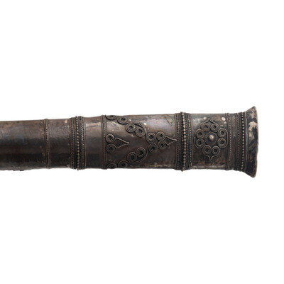 1.) 7.75" blade. 14.25" overall with hilt and sheath. Single edge straight point blade with a slightly concaved spine. Hilt is of ivory and features a silver collar with borderwork engravings. Sheath appears to be wood wrapped with sheets of silver that are decorated with braided silver wire, beading, and a cord wrapping.