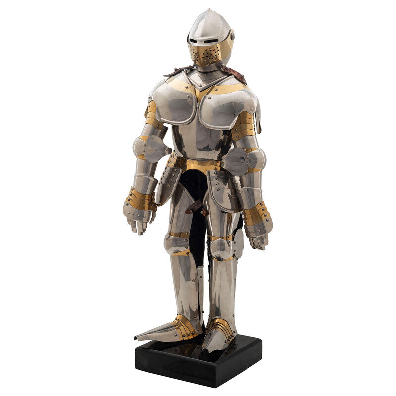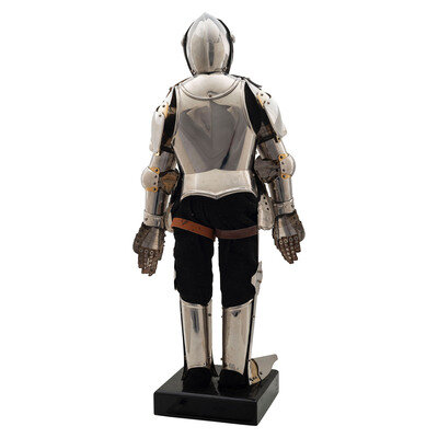 u7.25" x 11" x 26.5". Polished stainless steel finish with brazed details mounted on a black pained wood base with a black corduroy clad mannequin. Decorative figurine in the style of a knight clad in 16th Century plate armor complete with Armet. Major components are riveted together with the pauldrons and accompanying plate armor to the arms combined with rivets and suspended from the breastplate with leather bands. The Cuisses are likewise retained with leather straps and riveted to the knee cups, greaves, and pointed toe sabatons. Item shows no visible manufacturer markings.