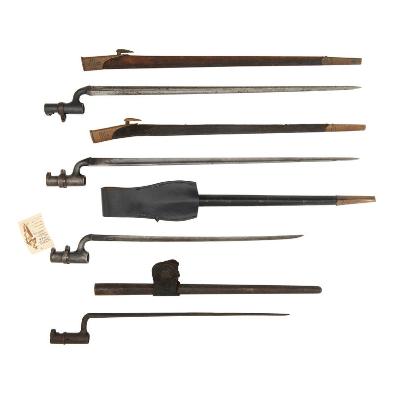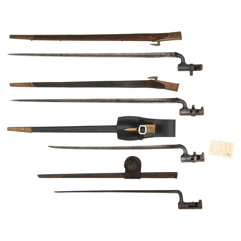 1.) U.S. M1873 with Scabbard - 16.25" blade. 19.25" overall with socket. Spike bayonet with fluted blade and U.S. marks to ricasso. Includes steel scabbard with leather hanger.