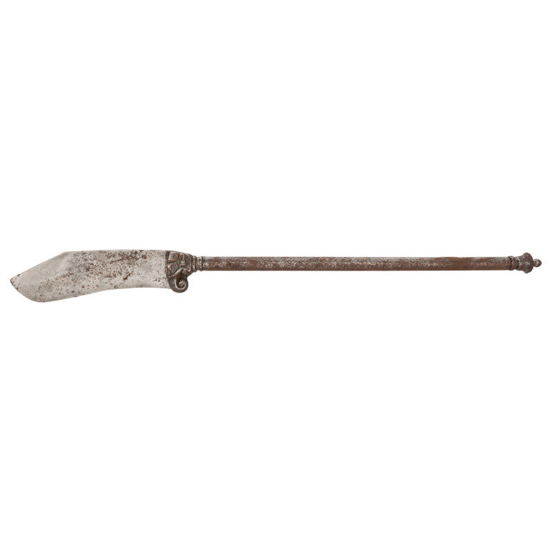 Known as an axe-knife, the bhuj (sometimes referred to as "elephant knife") originated in the Indian city of Bhuj. They are typically seen with elephant heads and hollow engraved hafts with a concealed blade. They are said to have been the favorite weapon of the Sindhi cavalry during the Soomra and Samma dynasties of Sindh.