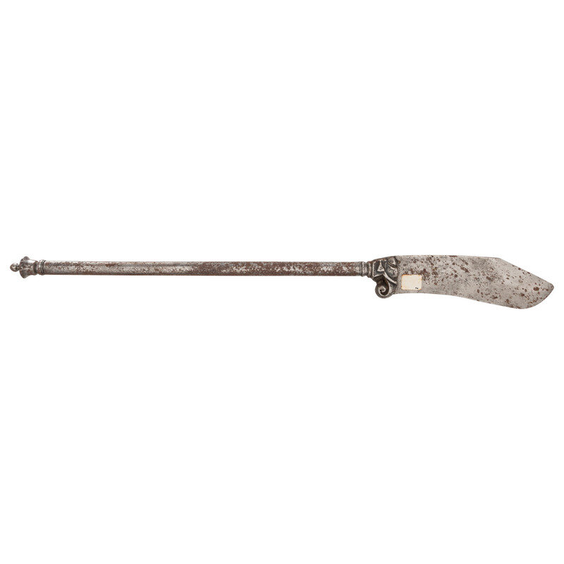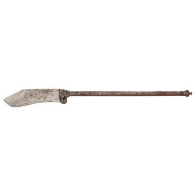 8" blade. 27" overall with haft. Single edge clipped point wide blade that appears to have faint engravings to both sides. Haft also has engraved floral geometric pattern overall. Pommel is crown shaped and removable revealing a 4" single edge blade. Item features elephant head knob at base of blade. Possibly gilded at some point, but now bare of finish.