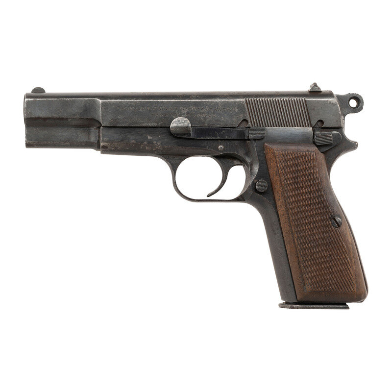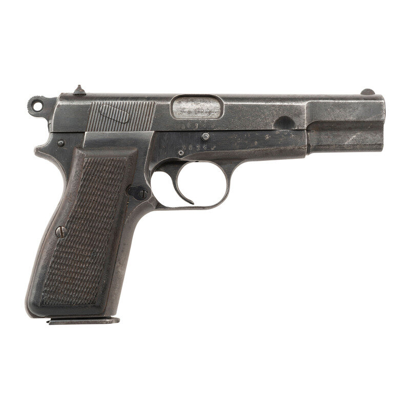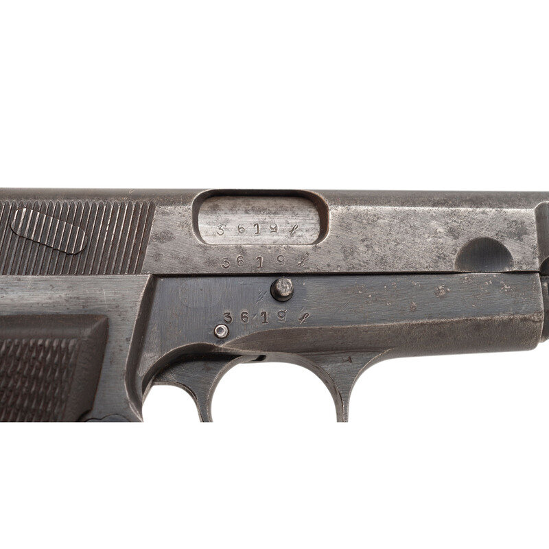 9mm Luger. 4.7" barrel. SN: 3619b. Blued metal finish with rough wartime polish mounting checkered walnut two piece grips and fixed front blade and drift adjustable rear notch sights. Short recoil operated single action autoloading pistol fed by detachable double stack magazines. Left slide is marked FABRIQUE NATIONALE D'ARMES DE GUERRE/HERSTAL BELGIQUE/BROWNING'S PATENT DEPOSE. Item shows {Eagle/WaA140} waffenamt markings on the left frame, left slide, and on the left barrel. The {WWII German Eagle} stamp appears over the chamber, and beside the waffenamt marks on the slide and frame. Serial numbers match on barrel, slide, and frame. Magazine safety deactivated. Magazine is unmarked.