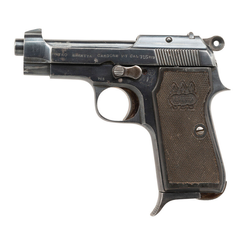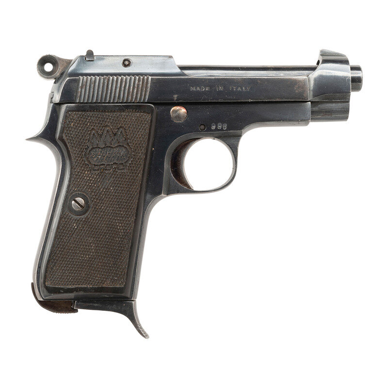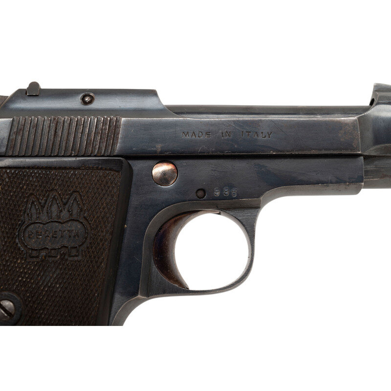 7.65mm. 3.5" barrel. SN: 996. Blued metal finish with fire blued small parts mounting checkered black synthetic grips showing a hand made facsimile of Beretta's post-war grip logo. Simple blowback operated single-action autoloading pistol fed by detachable magazines and patterned after the Beretta Model 1935 pistol. Left slide is crudely marked PIETRO BERETTA CARDONE V.T CAL 765 PAT. Item appears to be hand made, and show rough machining, tool marks, and hammer marks to internal components. Item was not made by Beretta, and is most likely a Khyber Pass copy.