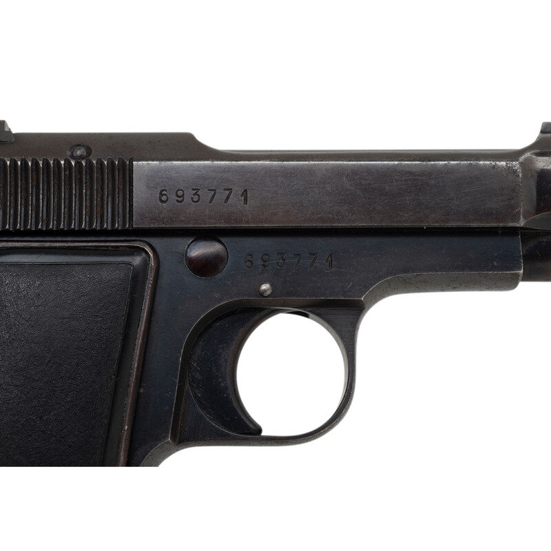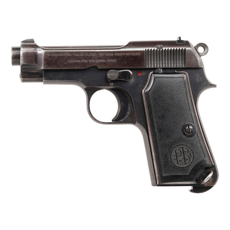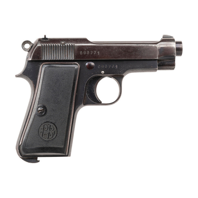 .380 ACP. 3.7" barrel length. SN: 693771. Blued metal finish with polished barrel mounting textured black synthetic PB logo grips. Simple blowback operated single action autoloading pistol fed by detachable single stack magazines. Left frame is struck with the {Crown/RE} mark indicating service in the Italian Army. Slide shows the two-line manufacturer and production date marking reading P. BERETTA-CAL. 9 CORTO-MO 1934-BREVETATO/GARDONE V.T 1938-XVI. Serial numbers match on barrel, slide, and frame. Item is without magazine.
