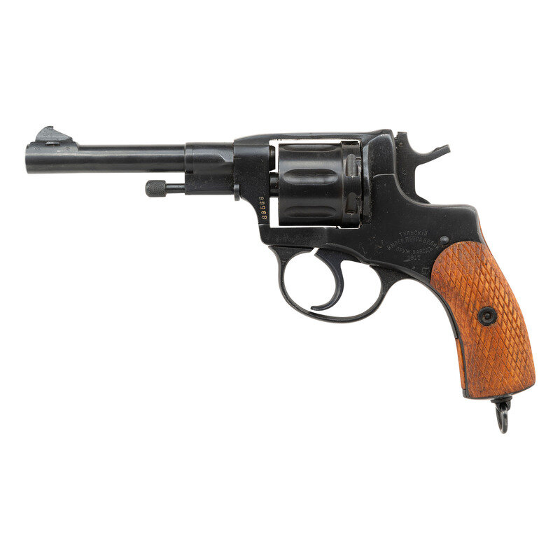 7.62 Nagant. 4.5" barrel. SN: 89566. Arsenal reblued metal finish overall with replaced checkered wood grips and mounting dovetail front blade and fixed rear notch sights. Double action seven-shot loading gate gas seal revolver. Left frame shows the original manufacture markings for the Tula Imperial Arsenal followed by a date marking of 1917. Soviet period boxed cartouche below this mark is indicative of post-WWII refinish prior to being stored. Import mark to barrel reads 1895 RUSSIA 7.62X38R/CAI ST ALB VT.