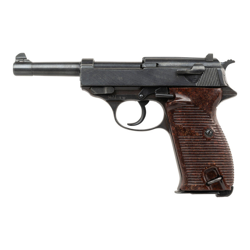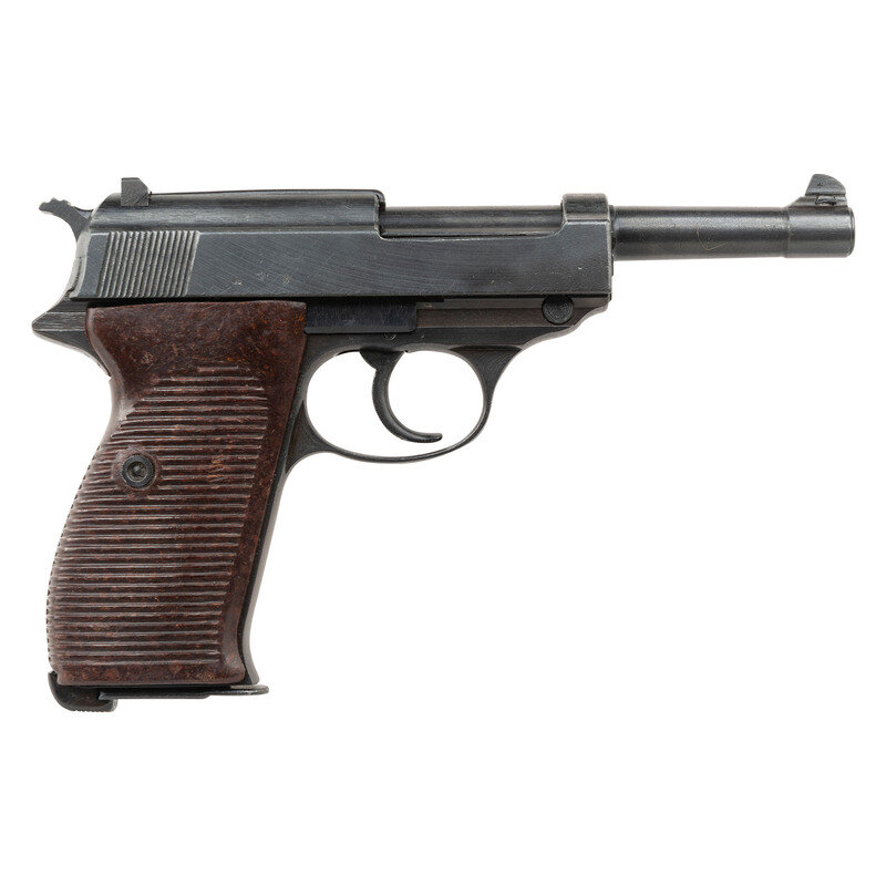 9mm. 4.9" barrel. SN: 5622x. Blued metal finish overall mounting horizontally serrated brown Bakelite grips and standard sights. Short recoil operated DA/SA autoloading pistol fed by detachable single stack magazines. Left slide is struck with the P.38 model marking followed by cyq manufacturer code indicating it was made by Spreewerk. Item further features the {Eagle/88} Waffenamt marking in two places on the right slide, on the left frame, left barrel, and the right side of the locking lug. {WWII German Eagle} stamp appears on the right slide, left barrel, and left locking lug. Right side of the barrel has been struck Bi followed by {Star} stamp. Item displays matching serial numbers. Magazine is blued and shows jvd maker code of Erste Nordboemische Metallwarenfabrik and {Eagle/WaA 708} waffenamt on the rear face of the magazine. Rear frame is import marked below beavertail with NHM. CO/SACCA/9MM GERMANY.