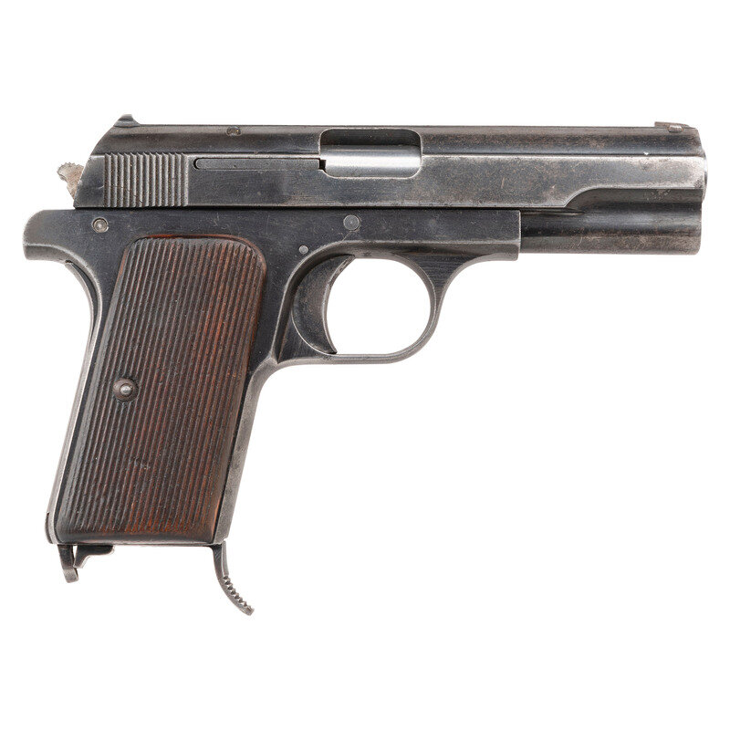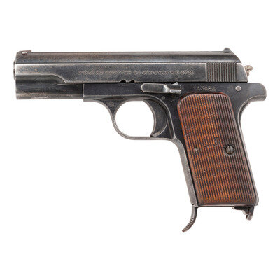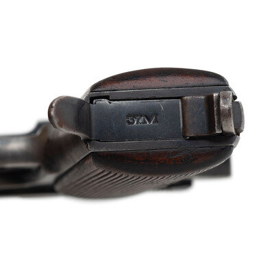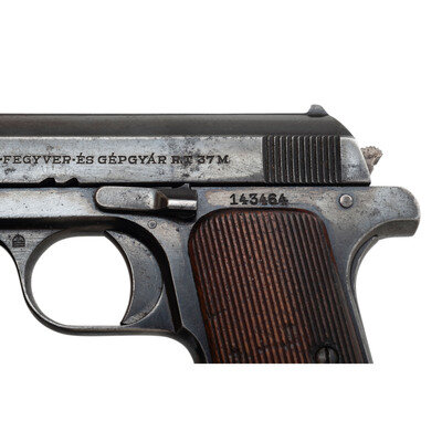 .380 ACP. 3.93" barrel length. SN: 143464. Blued metal finish with polished barrel and hammer mounting vertically serrated walnut grips. Simple blowback operated single action autoloading pistol fed by detachable single stack magazines. Left frame marked FEMARU-FEGYVER-ES GEPGYAR R.T 37M. Further marks include boxed E at the front of the slide and a proof on the barrel lug. Magazine floorplate marked 37M, and features a finger extension.
