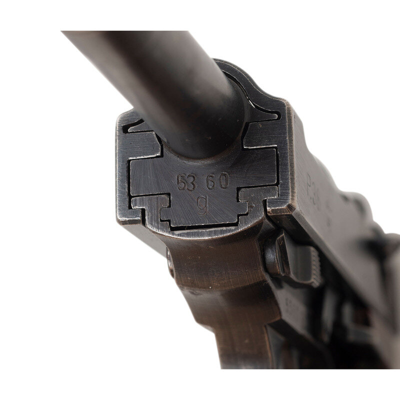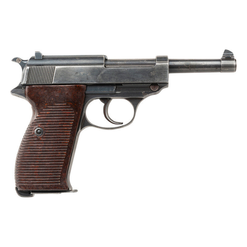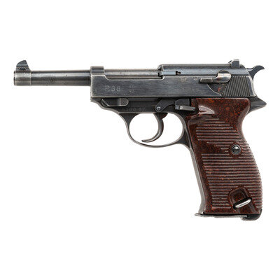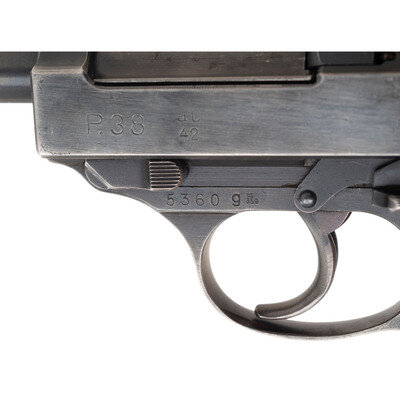 9mm. 4.9" barrel. SN: 5360g. Blued metal finish overall mounting horizontally serrated brown Bakelite grips and standard sights. Short recoil operated DA/SA autoloading pistol fed by detachable single stack magazines. Left slide features the model marking P.38 followed by manufacturer code ac/42, indicating it was manufactured by Walther in 1942. Serial numbers match. Item features the {Eagle/359} waffenamt marking in two places on the right slide, on the left frame, left barrel, and the right side of the locking block. Item further shows the {WWII German Eagle} stamp on the right slide, left barrel, and left side of the locking lug. Magazine is blued and is struck P.38 on the left side above the baseplate. Multicolor tint to the safety lever.