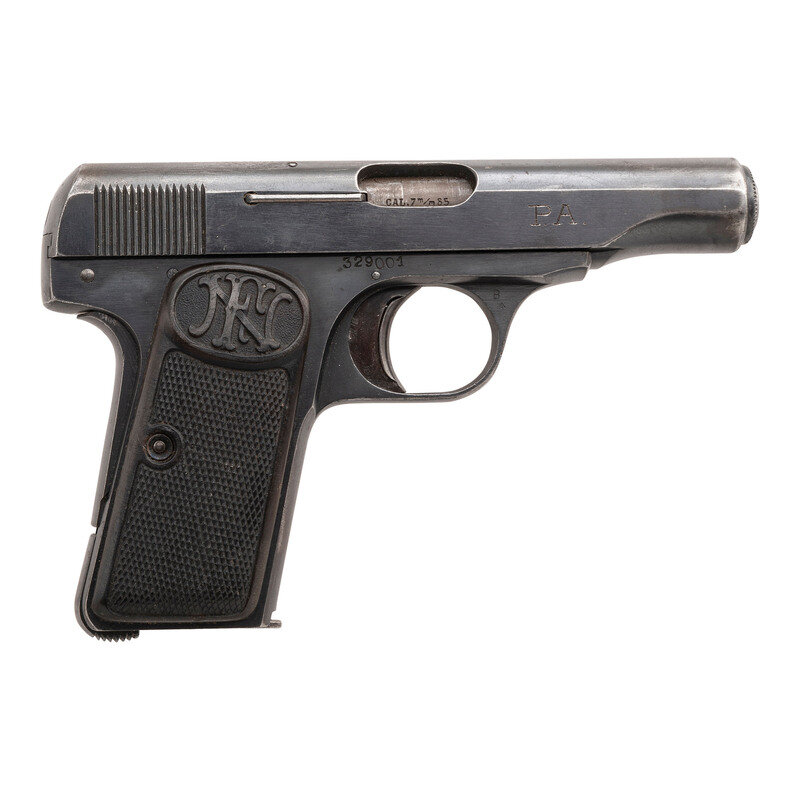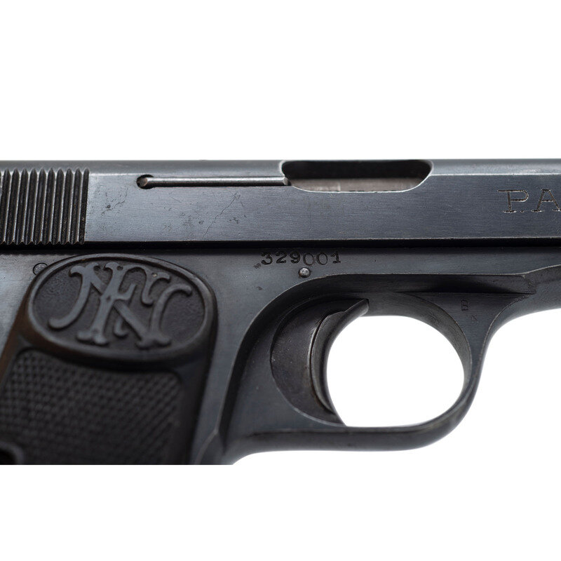 .32 ACP. 3.5" barrel length. SN: 329001. Blued metal finish with polished barrel mounting checkered Bakelite FN marked grips. Simple blowback operated striker fired autoloading pistol fed by detachable single stack magazines. Left slide shows the two-line FN legend reading FABRIQUE NATIONALE D'ARMES de GUERRE HERSTAL BELGIQUE/BROWNING'S PATENT DEPOSE. Item shows Belgian firing proofs on the left slide, right barrel, and left frame, along with FN marking to the triggerguard. Right slide struck with the initials P.A., likely by an end user. Serial numbers match on the barrel, frame, and slide.