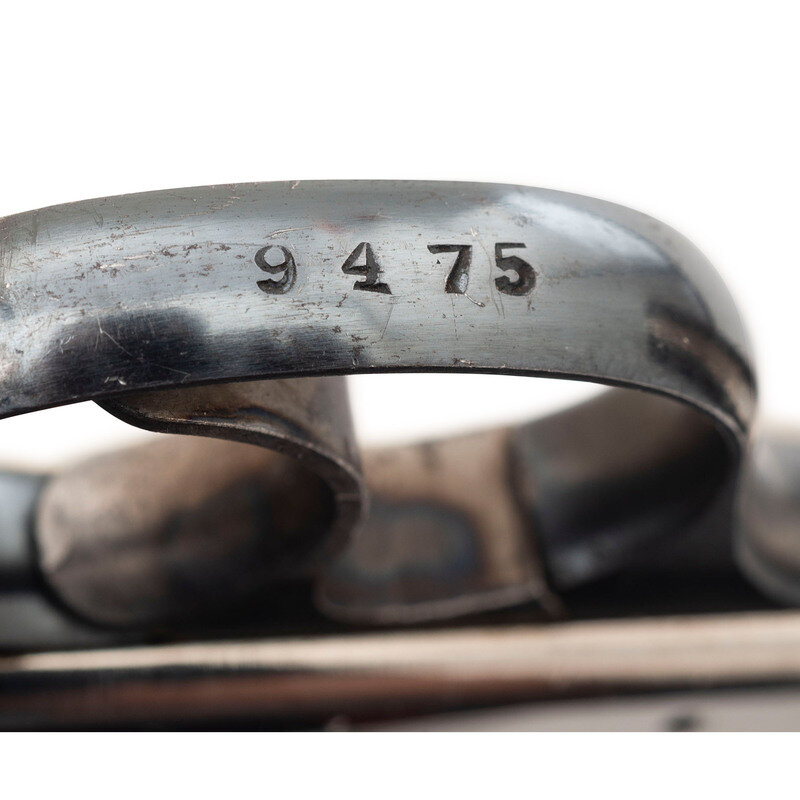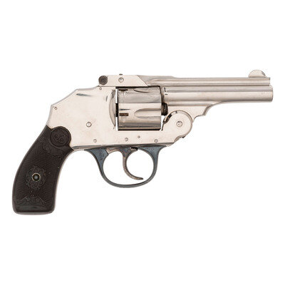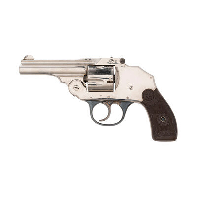 .38 S&W. 3.25" barrel. SN: D9475. Nickel plated finish with blued triggerguard and case colored hammer mounting checkered hardrubber {Owl} logo and Iver Johnson monogram grips with floral embellished edges. DAO hammerless five-shot revolver featuring rear latch notch and front blade sights. Top of the barrel is marked IVER JOHNSON'S ARMS & CYCLE WORKS/FITCHBURG MASS. U.S.A. Butt displays two-line patent marks reading PAT. JUNE 16. 16. AUG. 25. 98/SEPT. 16. 04. PATS PENDING.