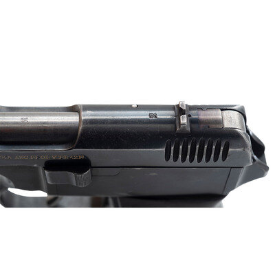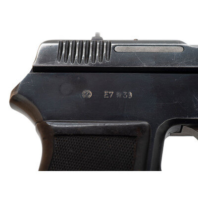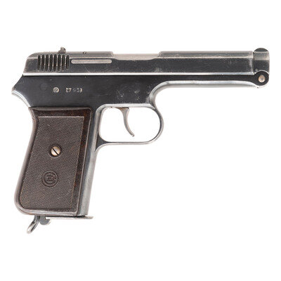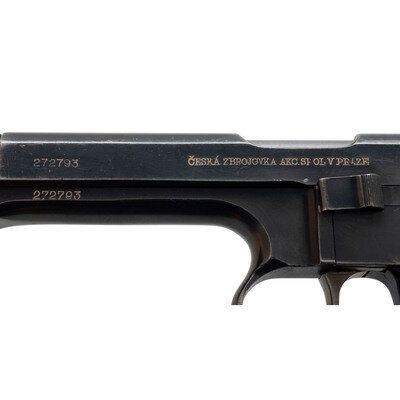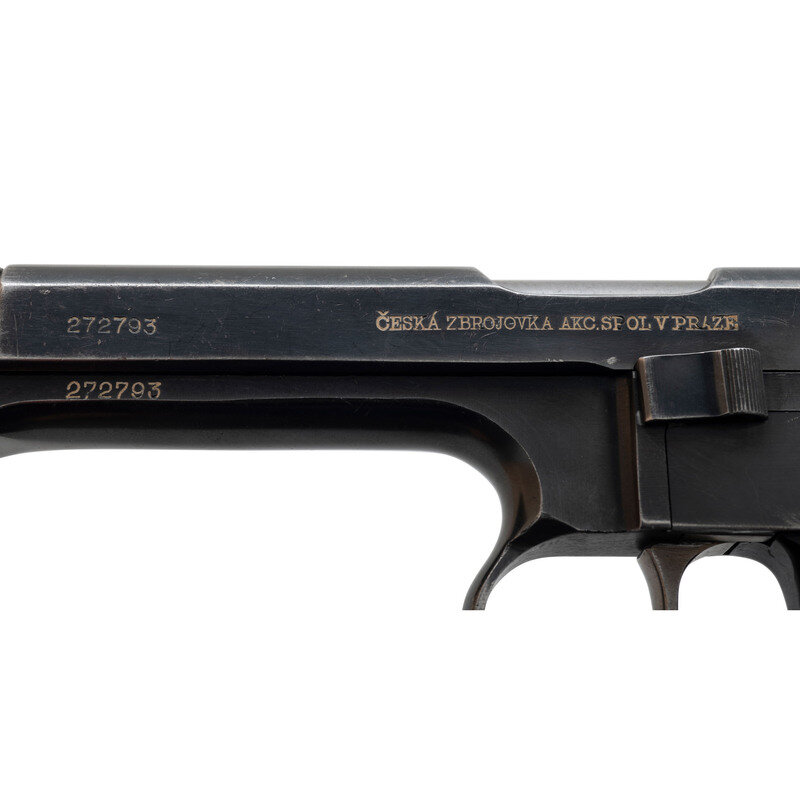 .380 ACP. 4.625" barrel length. SN: 272793. Blued metal finish with straw colored small parts mounting one piece checkered CZ logo Bakelite grips. Simple blowback operated DAO autoloading pistol fed by detachable single stack magazines. Left slide struck with manufacturer marking CESKA ZBROJOVKA AKC.SP OL V PRAZE. Top of the slide and chamber both show the {Czech Lion} proof marking. Right frame shows the CZ logo followed by E7 {Czech Lion} 39, indicating it was manufactured in 1939.