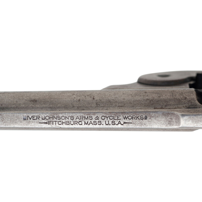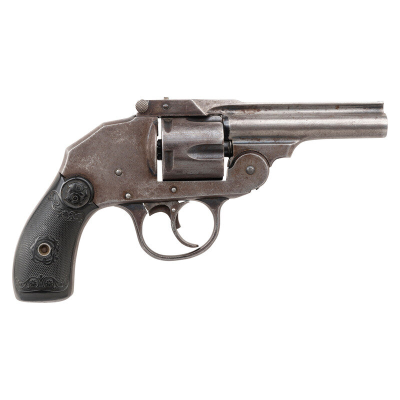 .38 S&W. 3.25" barrel. SN: 9159. Blued metal finish overall with color case hardened trigger mounting checkered hardrubber {Owlhead} grips. DAO five-shot hammerless top break revolver featuring automatic ejection and a trigger mounted safety mechanism. Barrel rib displays two-line maker address reading IVER JOHNSON'S ARMS & CYCLE WORKS/FITCHBURG MASS, U.S.A. Front sight blade has been removed, and the serial number to the trigger appears to be force matched to the frame. Three notched scratched into the base of the butt.