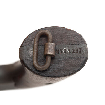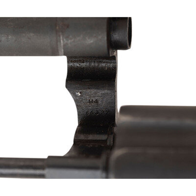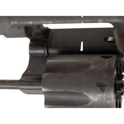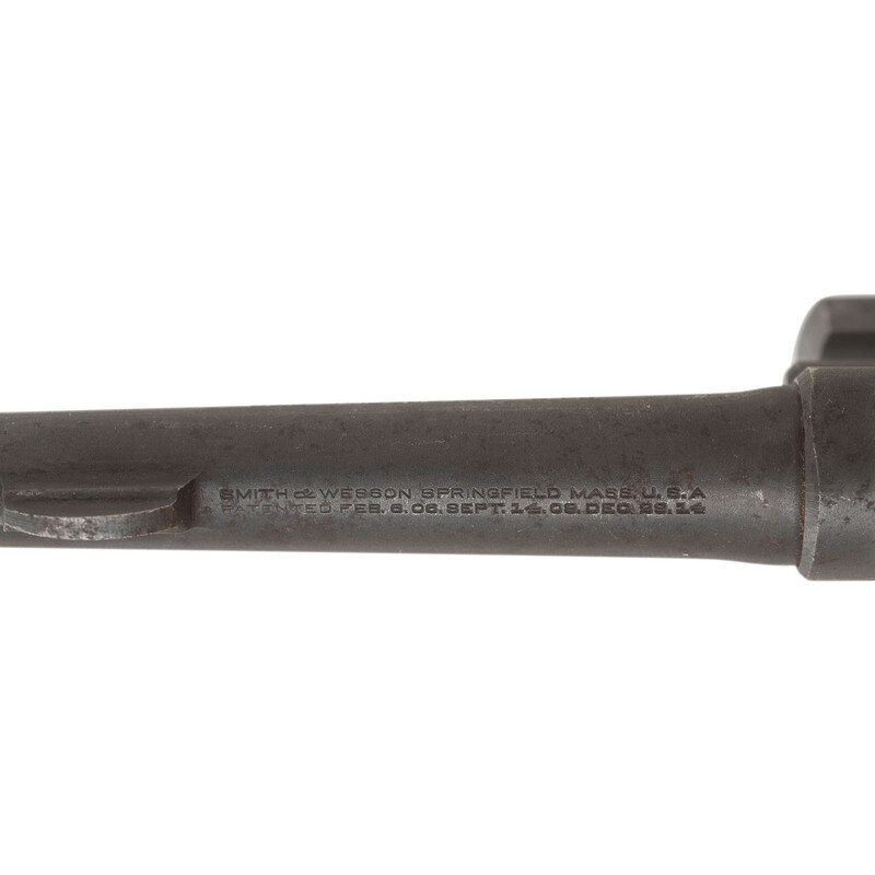 .38 Special. 4" barrel. SN: V121167. Parkerized metal finish overall with case colored hammer and trigger mounting smooth walnut grips and a lanyard loop to the butt. Double action hand ejector six-shot revolver featuring topstrap notch and half moon front blade sights on a five screw frame. Standard manufacturer and patent date mark appears on top of the barrel in two lines reading SMITH & WESSON SPRINGFIELD MASS, U.S.A./PATENTED FEB. 6. 06. SEPT. 14. 09. DEC. 29. 14. Left barrel struck SMITH & WESSON with the right showing caliber marking 38 S.&W. SPECIAL CTG. Right frame is marked MADE IN U.S.A. with the right sideplate displaying the large Smith & Wesson monogram grip. Topstrap is marked U.S. NAVY. Serial numbers match on the right grip panel, barrel, frame, cylinder, and star extractor. Displays the rough tool marks overall that are the hallmark of wartime manufactured Smith & Wesson revolvers.