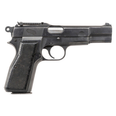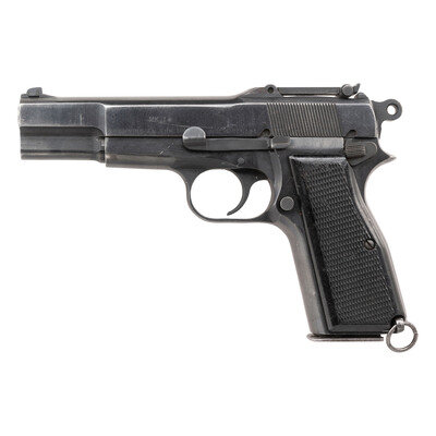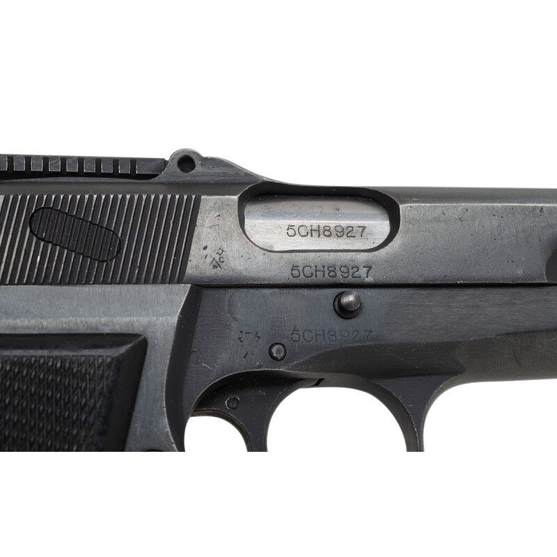 9mm. 4.75" barrel. SN: 5CH8927. Blued metal refinish overall with polished barrel mounting checkered black black synthetic grips, and featuring adjustable tangent rear notch and dovetailed front blade sights. Short recoil operated single action autoloading pistol fed by detachable double stack magazines. Backstrap features the dovetail cut for a detachable shoulder stock, and a lanyard loop is installed at the left of the butt. Left slide is marked MK. I*/BROWNING FN 9MM. HP INGLIS CANADA. Right slide and frame are both struck with Canadian {Crossed Flags} inspection markings that have been shallowly struck. Serial numbers match on the frame, slide, and barrel. Magazine is stamped JL on the forward flat and features an aluminum follower. Item has been import marked on butt KFS ATL GA. The serial number of this item, along with its long range sights and stock cut, indicate it was originally manufactured in Canada for the Republic of China. Magazine safety has been deactivated.