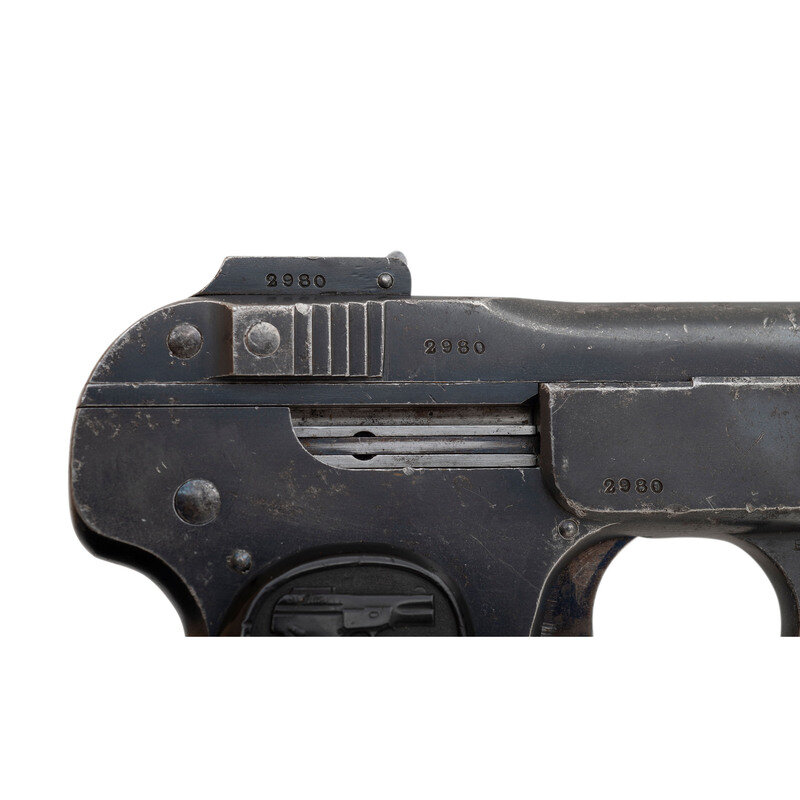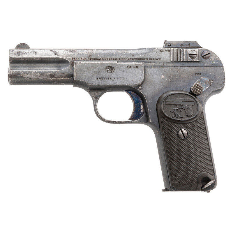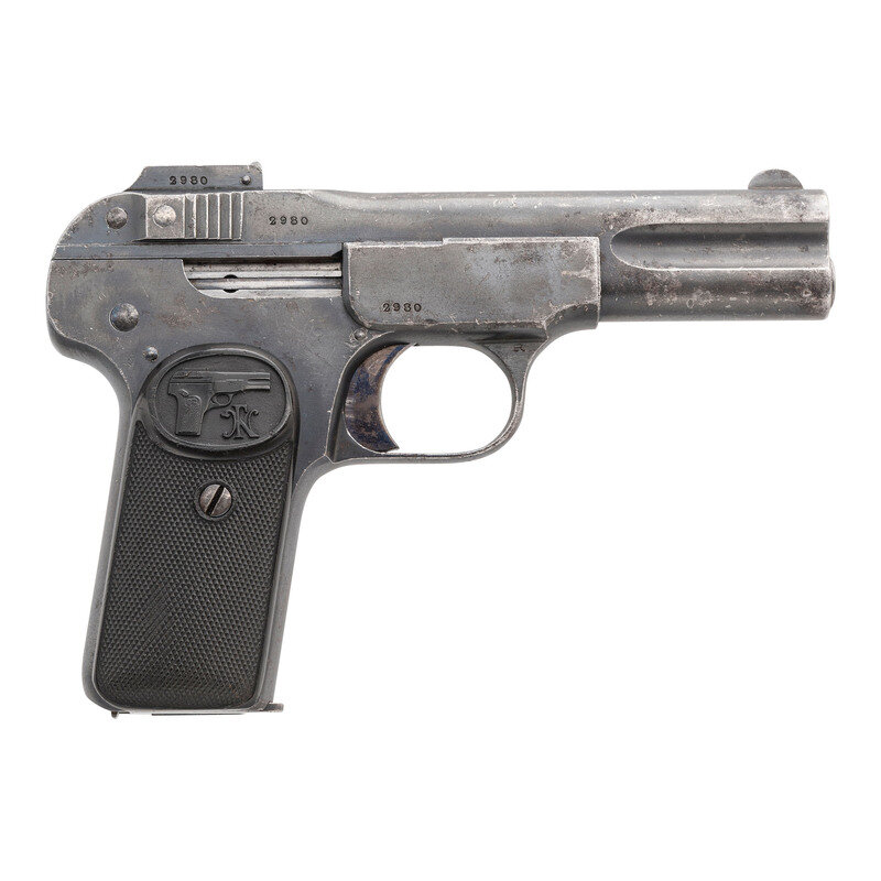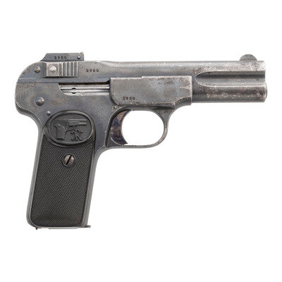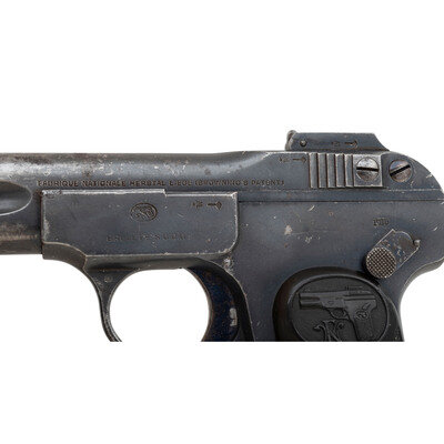 .32 ACP. 4" barrel length. SN: 2980. Blued metal finish with polished bolt and nitre blued small parts mounting checkered black synthetic FN logo grips. Simple blowback operated striker action autoloading pistol fed by detachable single stack magazines. Left slide struck FABRIQUE NATIONALE HERSTAL LIEGE (BROWNING'S PATENT) with left frame struck with {FN} logo over BREVETE S.G.D.G. Item shows matching serial numbers to major components with Belgian firing proofs to each. Magazine is unmarked.