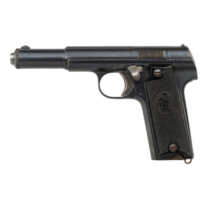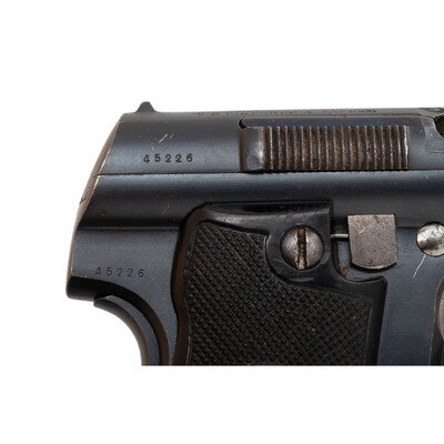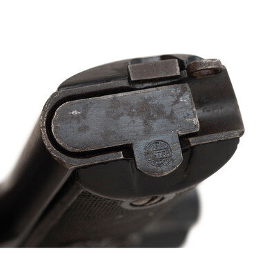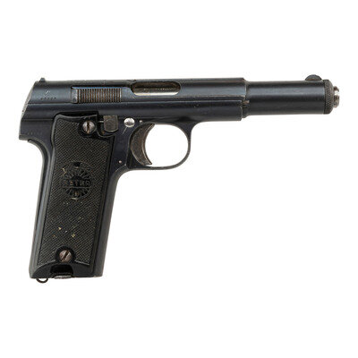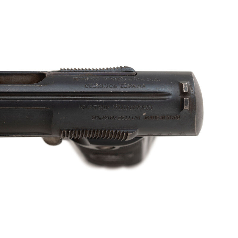 9mm Para. 5.3" barrel length. SN: 45226. Blued metal finish overall with polished barrel, internals, and small parts mounting two-piece black synthetic ASTRA logo grips. Simple blowback operated internal hammer fired autoloading pistol fed by detachable single stack magazines. Item shows Spanish proof marks on the left frame, left rear slide, and on the barrel. Markings to the top of the slide include maker mark reading UNCETA Y COMPANIA S.A./GUERNICA ESPANA along with the model and caliber marking "ASTRA" MOD. 600/43/9m/m PARABELLUM MADE IN SPAIN. Comes with one unmarked magazine.