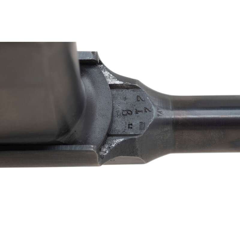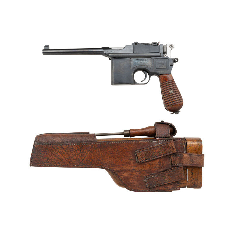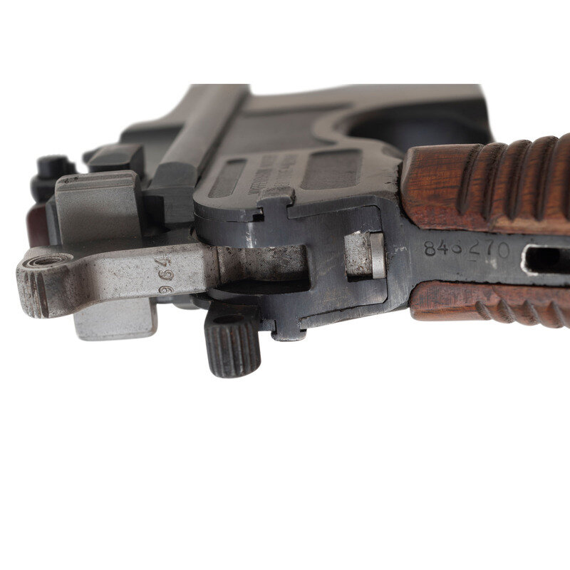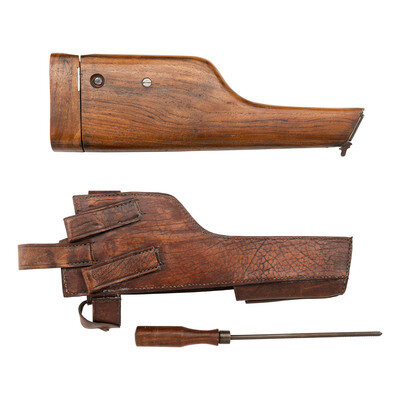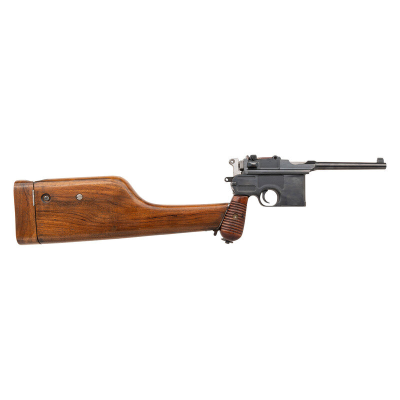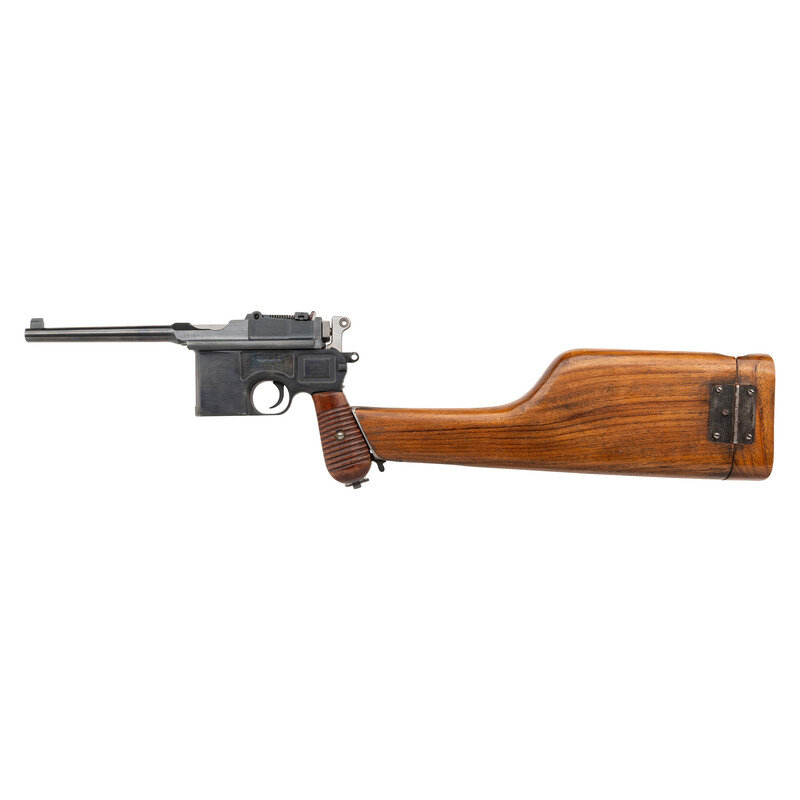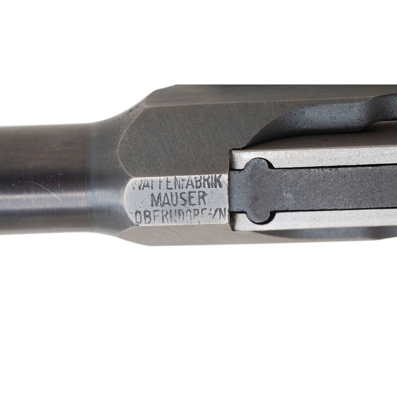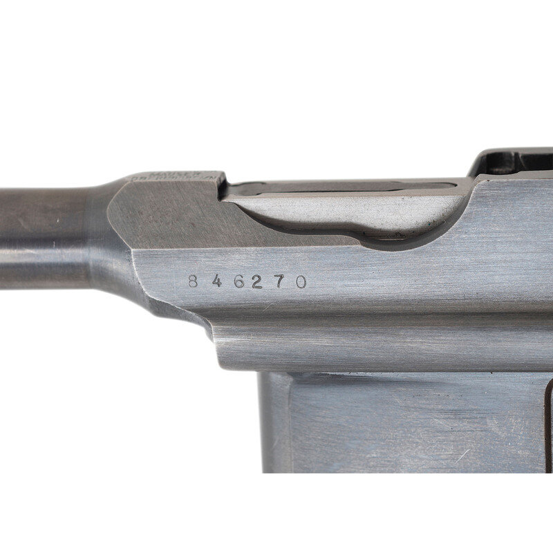 .30 Mauser. 5.5" barrel. SN: 846270. Blued metal refinish overall with polished and fire blued small parts mounting horizontally serrated walnut grips. Short recoil operated single action autoloading pistol fed by an internal magazine charged with stripper clips. Left frame displays the MAUSER banner with the chamber marked WAFFENFABRIK/MAUSER/OBERNDORF A/N. Right frame struck WAFFENFABRIK MAUSER/ OBERNDORF A. NECKAR. Commercial proof marks appear to have been removed during refinish with only the {Crown/U} visible on the rear of the bolt. Importer mark to left frame marked OYSTER BAY IND. INC/OYSTER BAY, N.Y. USA. Serial numbers do not match. Comes with a reproduction detachable shoulder stock and leather carrier with reproduction wood handled cleaning rod.