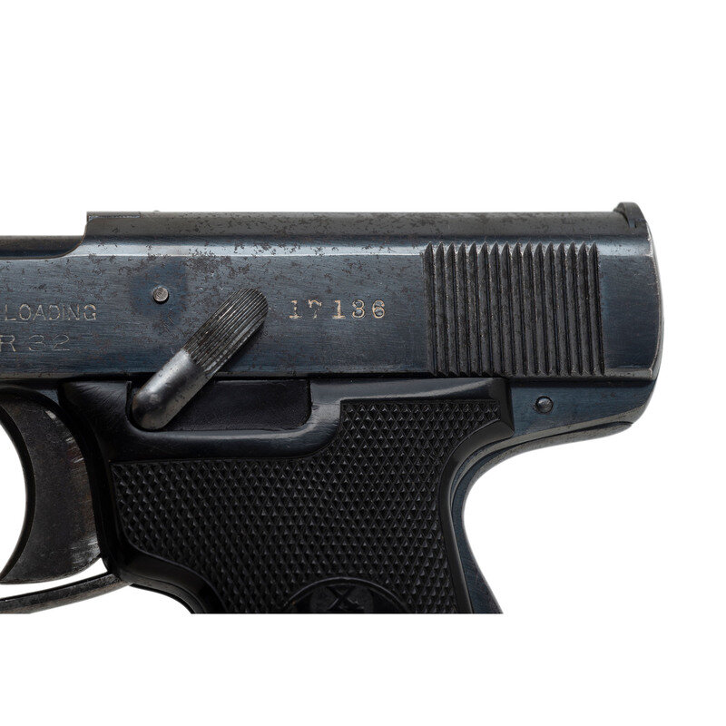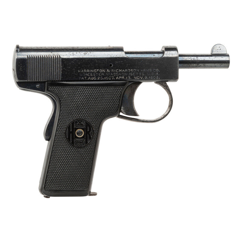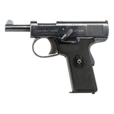 .32 ACP. 3.5" barrel length. SN: 17136. Blued metal finish with checkered black synthetic H&R logo grips and featuring fixed rear notch and half moon front blade sights. Simple blowback operated striker action autoloading pistol fed by detachable single stack magazines. Left slide is marked H.&R. SELF-LOADING/CALIBER 32. Right slide is struck with three line manufacturer and patent mark reading HARRINGTON & RICHARDSON ARMS CO./WORCESTER. MASSACHUSETTS, U.S.A./PAT. AUG. 20. 1907. APR. 13. NOV. 9. 1909. Serial numbers match on the slide, barrel, and frame.