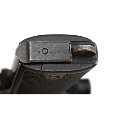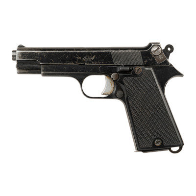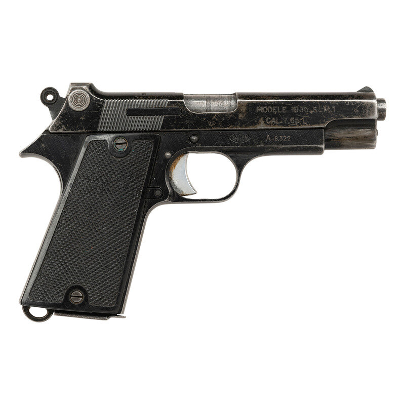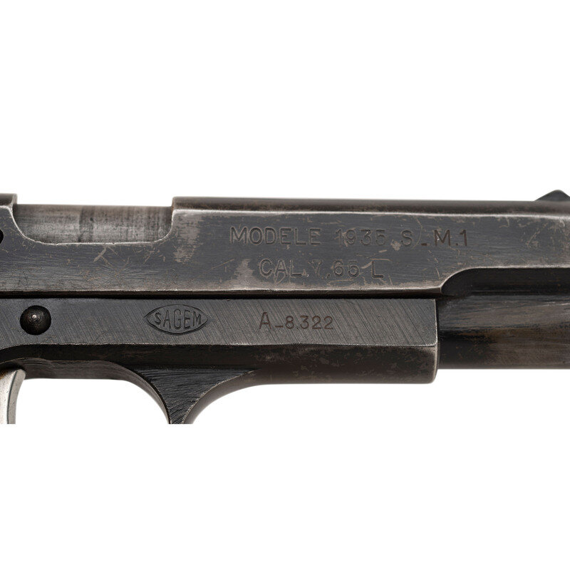 7.65 French Long. 4" barrel. SN: A8322. Black enamel finish with polished trigger to the trigger and mounting checkered black synthetic grips. Short-recoil operated single action autoloading pistol fed by detachable single stack magazines. Left slide and right frame show the SAGEM manufacturer marking with the right slide further displaying the model and caliber marking MODELE 1935 S-M.1/CAL. 7,65 L.