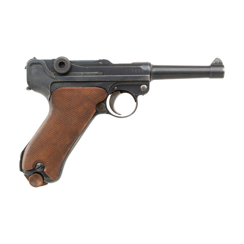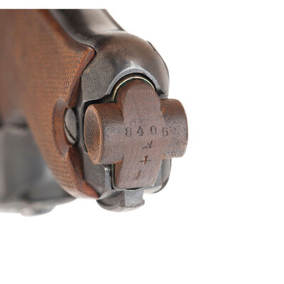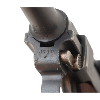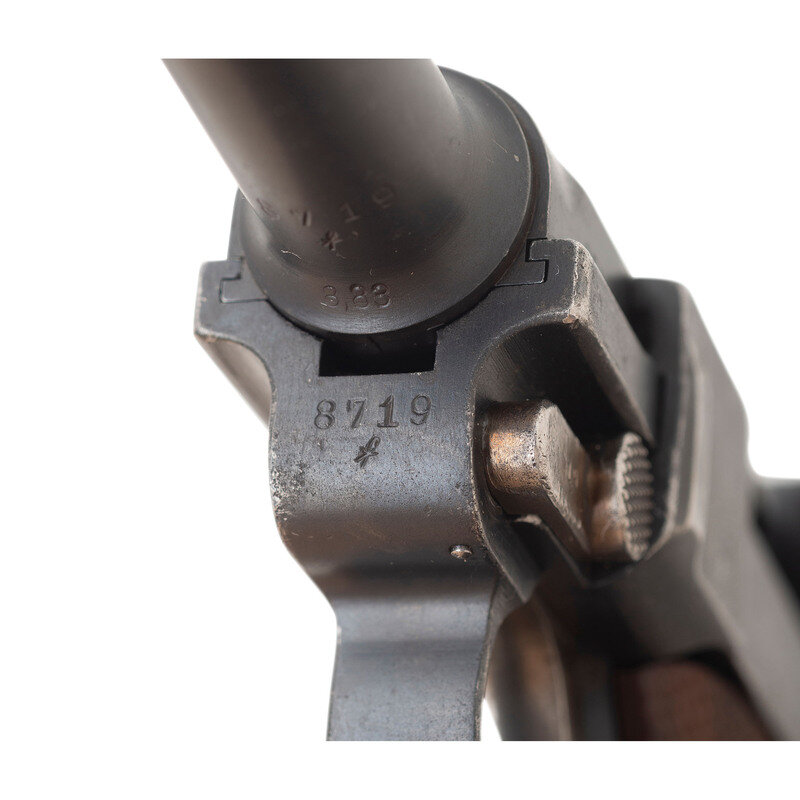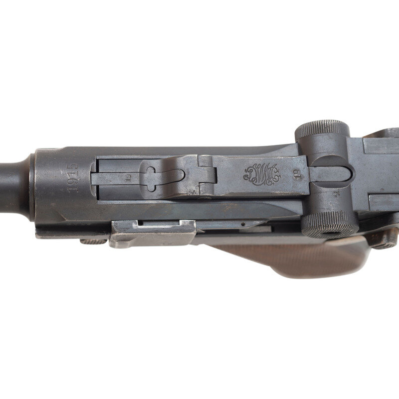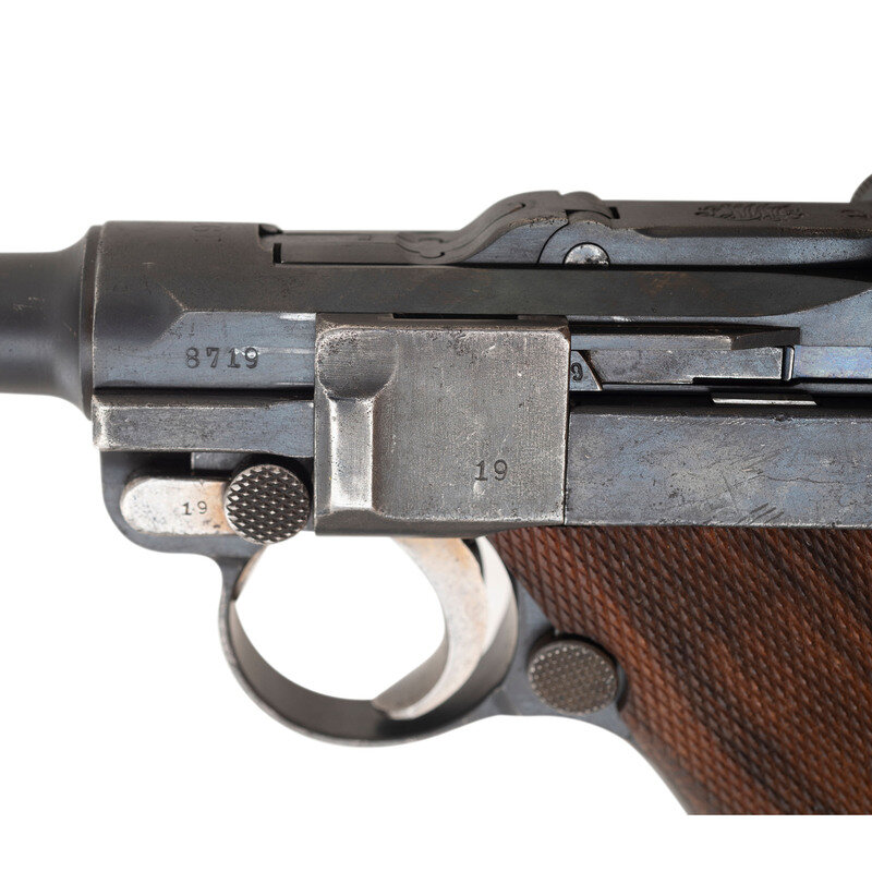 9mm Para. 3.9" barrel length. SN: 8719p. Blued metal refinish with straw colored and niter blued small parts mounting replaced checkered walnut grips. Short recoil operated internal striker fired toggle action autoloading pistol fed by detachable single stack magazines. Toggle link shows the DWM logo for Deutsche-Waffen und Munitionsfabriken, the chief manufacturer of P08 pistols during World War I. Date on the barrel extension reads 1915 with the barrel displaying a bore gauge reading of 8,83. Right barrel extension is struck with the WWI German {Reichsadler} marking along with three {Crown/Gothic Letter} inspection markings. Extractor shows the standard GELADEN marking with the safety struck GESICHERT. Serial numbers match on the majority of components, but the grips have been replaced, and the pistol comes with a non matching magazine. Magazine features a nickel plated body and wood base plug.