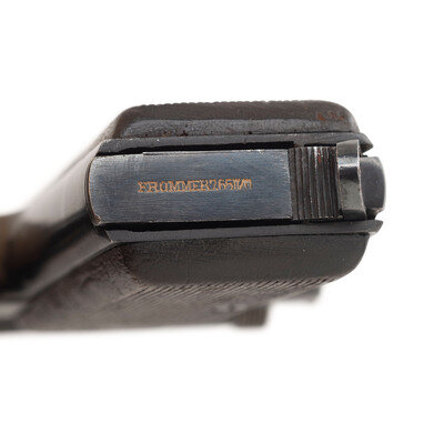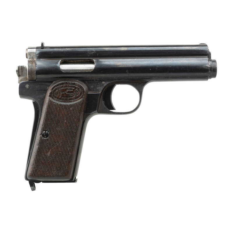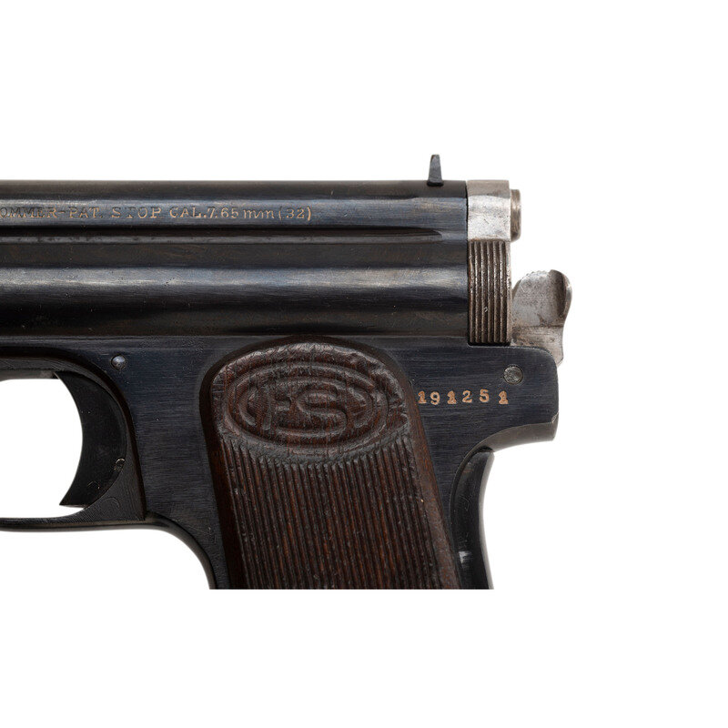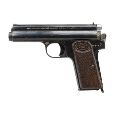 .32 ACP. 3.7" barrel length. SN: 191251. Blued metal refinish with polished internals and small parts mounting two piece wood FS logo grips. Long-recoil operated single action autoloading pistol fed by detachable single stack magazines. Left frame is struck FEGYVERGYAR-BUDAPEST-FROMMER-PAT. STOP CAL. 7.65m/m(32). Proof marks struck into left frame above the triggerguard. Comes with one magazine displaying a matching serial number and baseplate marked FROMMER 7.65m/m.