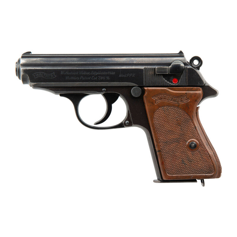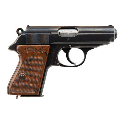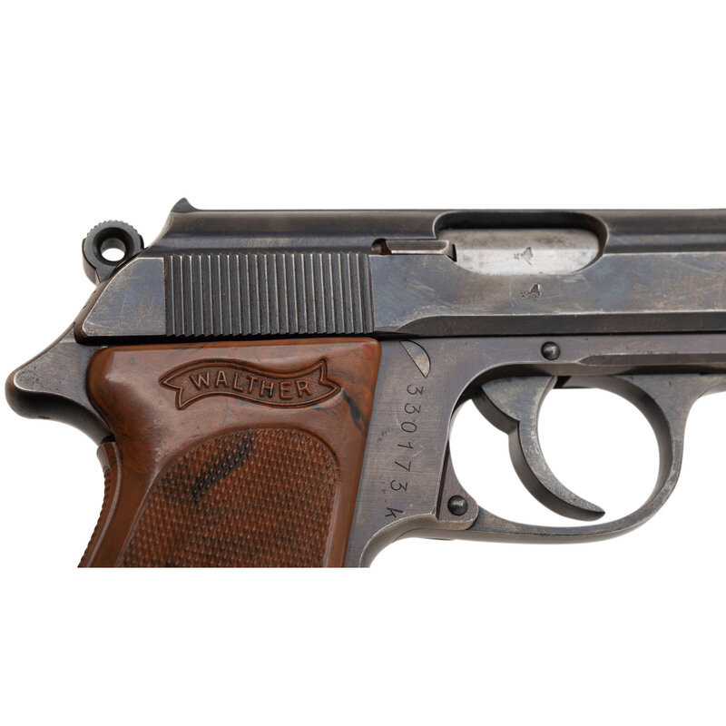 .32 ACP. 3.3" barrel length. SN: 330173K. Blued metal finish with polished chamber mounting one piece wrap-around WALTHER banner brown synthetic grips. Simple blowback operated DA/SA autoloading pistol fed by detachable single stack magazines. Item shows the {Eagle/N} commercial proof marking to the right muzzle, right chamber, and on the right slide below the ejection port. Left slide is struck with the WALTHER banner followed by Waffenfabrik Walther, Zella-Mehlis (Thur.)/Walther's Patent Cal. 7,65 m/m Mod. PPK. Grips likewise show the WALTHER banner, as does the blued magazine.