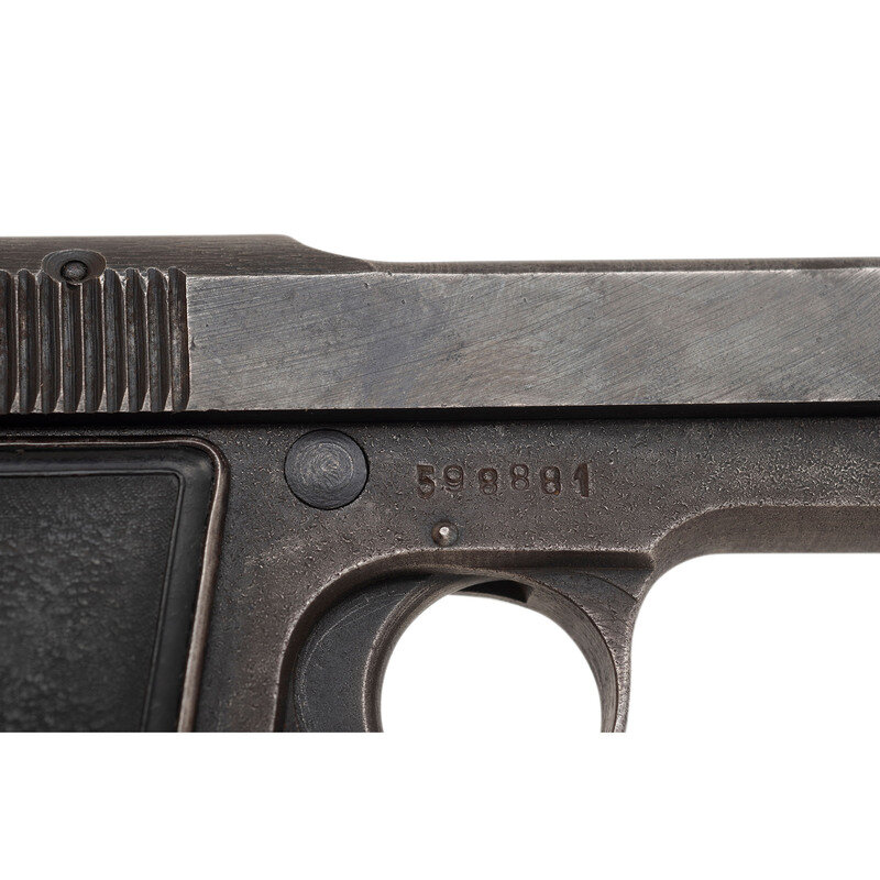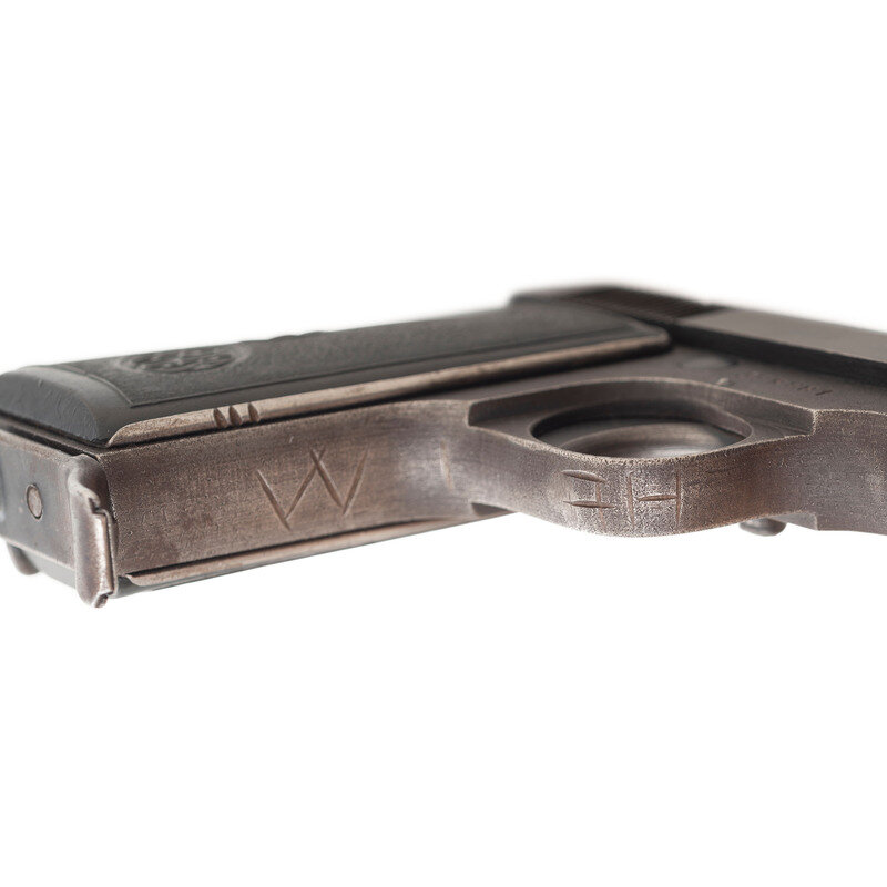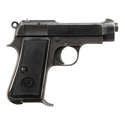 .32 ACP. 3.5" barrel length. SN: 598881. Blued metal finish over rough wartime metal finish mounting textured PB initial black synthetic grips. Simple blowback operated single-action autoloading pistol fed by detachable single stack magazines. Left slide is struck P. BERETTA-Cal 765-Brevettata/Gardone V.T. 1944. The S and F safety markings are shallowly struck. The initials HEIM have been cut into triggerguard and gripstrap, likely with a bayonet or knife. The forward edge of the right grip panel has three notches cut into it. Comes with one magazine.