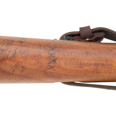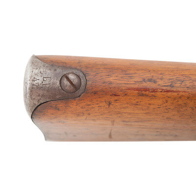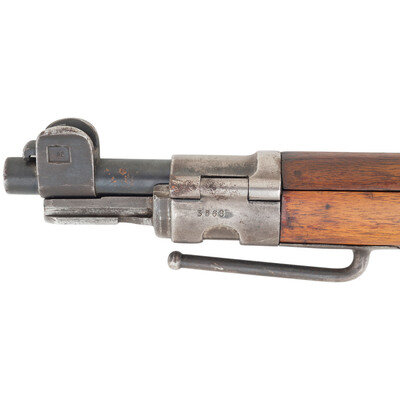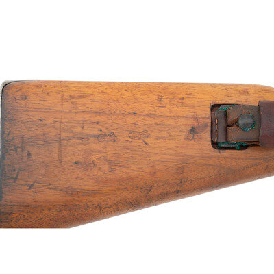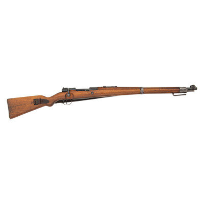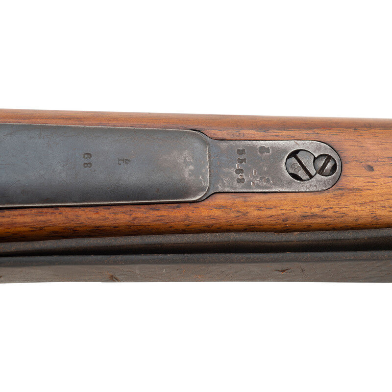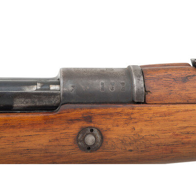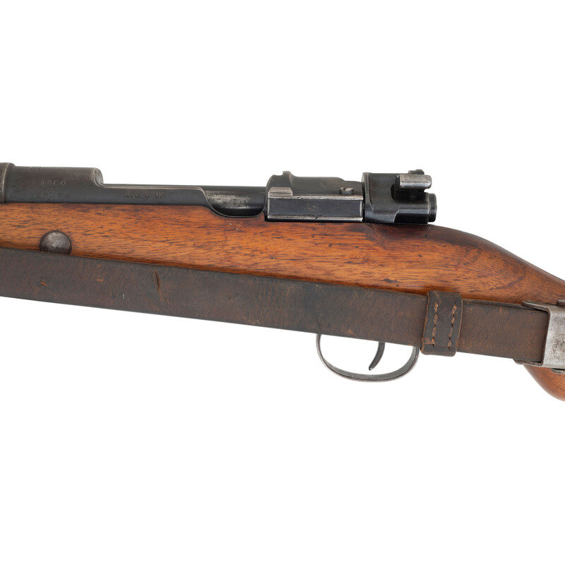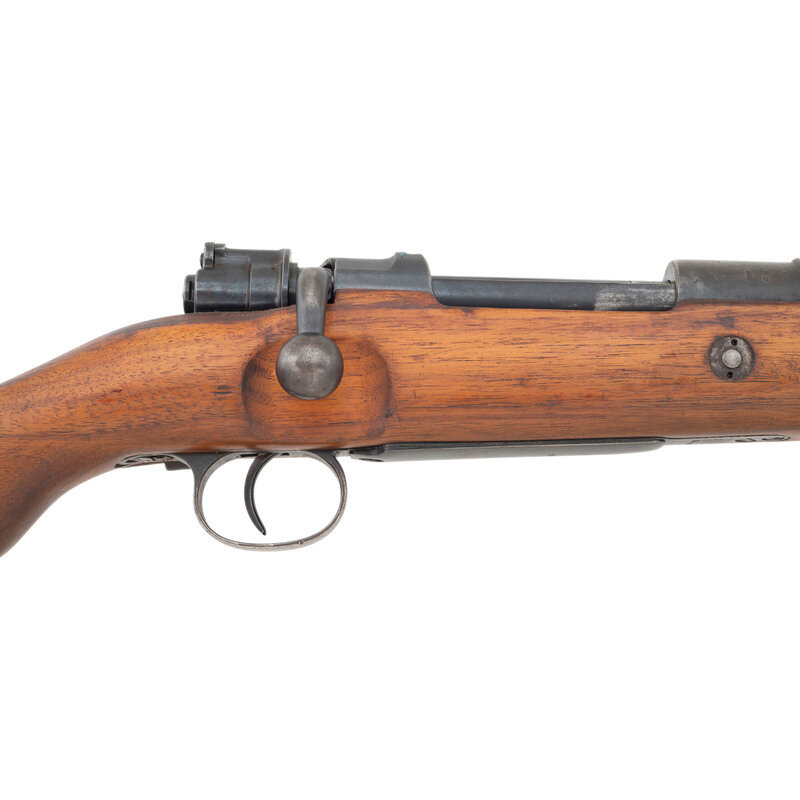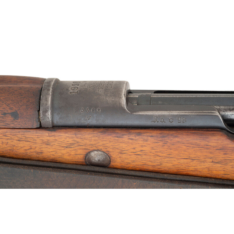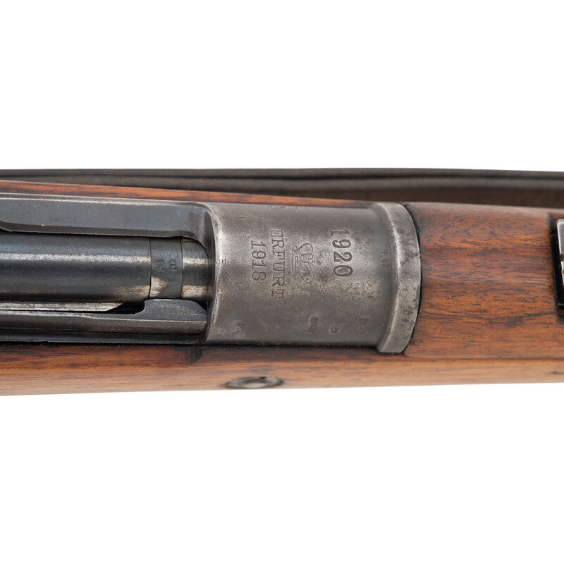 7.92x57mm. 23.62" barrel length. SN: 3568n. Blued metal refinish overall with polished butt set in a walnut semi-pistol grip stock with full length upper handguard and without stock disc. Bolt-action internal magazine fed repeating rifle charged with stripper clips and featuring the distinctive full length upper handguard, turned down bolt handle, and stacking rod typical of the Kar 98AZ (later renamed Kar 98a) model. Receiver shows the {Crown/ERFURT/1918} marking indicating it was made by Erfurt in 1918, with a further date of 1920 struck above this indicating the rifle was retained as the property of post-World War I Germany. Left receiver is struck with the Imperial German {Reichsadler} mark with the right displaying triple {Crown/Gothic Letter} inspection stamps. A second Reichsadler appears on the bolt handle. Receiver ring additionally marked with a 7,92 bore gauge marking. Further Gothic Letter inspection stamps appear on the follower, rear sight, sight spring, barrel bands, magazine floorplate, bolt right butt, and bayonet lug. Serial number to the toe has been struck. Top of the buttplate displays unit marking L.P./47. Serial numbers do not match on the bolt components or receiver, with stock mark indicating the rifle was Arsenal rebuilt at some point. Comes with a German pattern leather sling.
