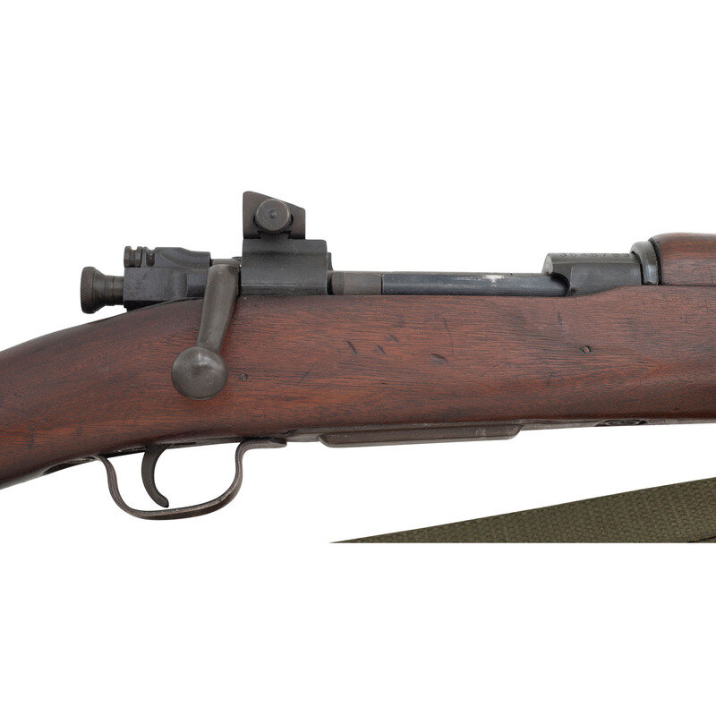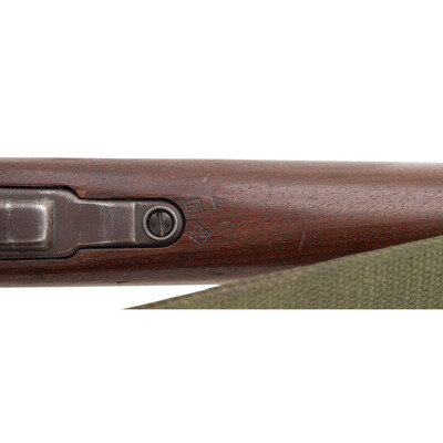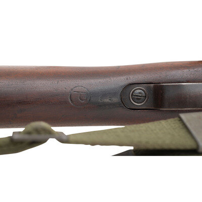 .30-06. 24" barrel length. SN: 3648793. Grey/green parkerized metal finish. Walnut 'S" stock has a plain straight grip and forearm, with handguard. Bolt action rifle with an adjustable peep rear sight and blade front sight with sight protector. Item features an internal magazine, bayonet lug forend, triple stacking swivels, and a trapdoor buttplate void of contents. Markings include Smith-Corona 1903-A3 marks to receiver and S C/{flaming bomb}/3-43 to barrel. Stock is marked with faint FJA Frank J. Atwood inspector cartouche and circle P proofs. Includes an OD green web sling.