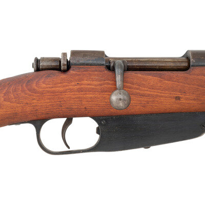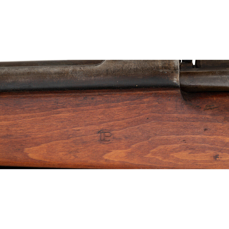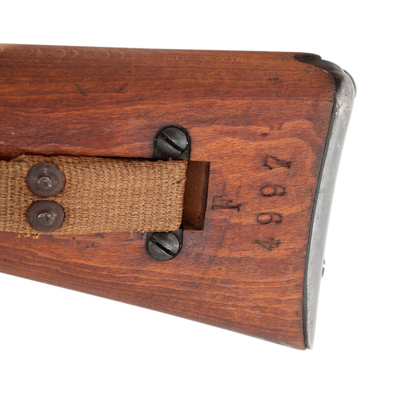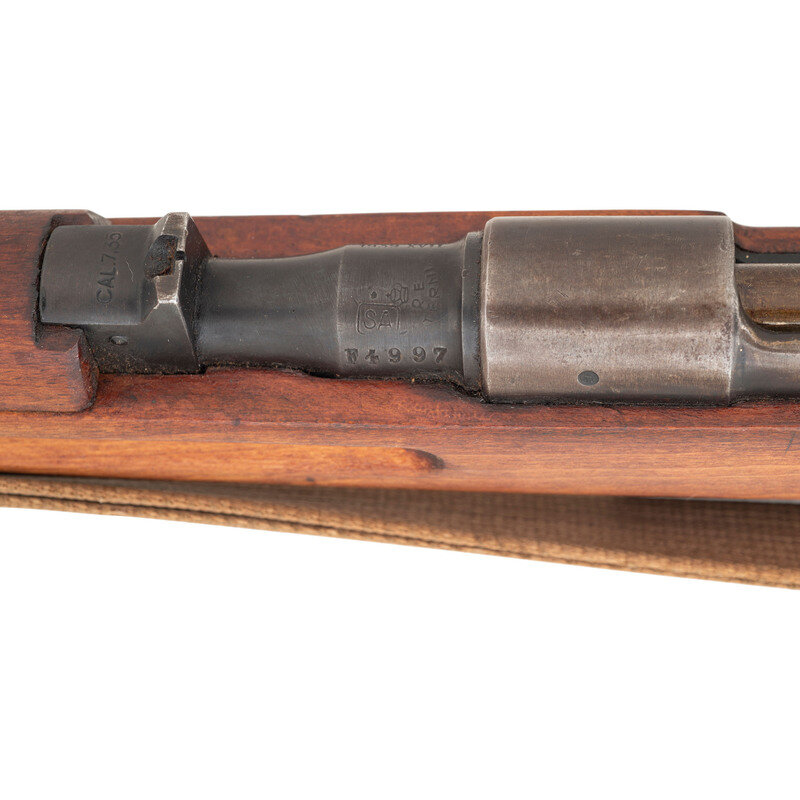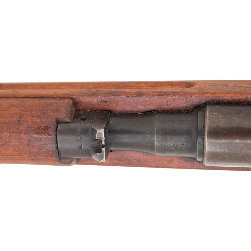 7.35mm. 22" barrel. SN: F4997. Blued metal finish set in a straight wrist walnut stock with half length upper handguard featuring fixed rear notch and barleycorn front blade sights. Bolt-action repeating rifle fed by an internal box magazine charged with Mannlicher pattern en-bloc grips. Barrel shank is struck with the manufacturer marking {Crown/RE/TERNI} on top with the right side struck with date 1939 XVII and the left showing the serial number below a Finnish boxed SA marking. Serial number matches on the left stock at butt and on the barrel shank. Comes with a canvas sling, and a Model 1938 folding bayoonet.