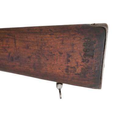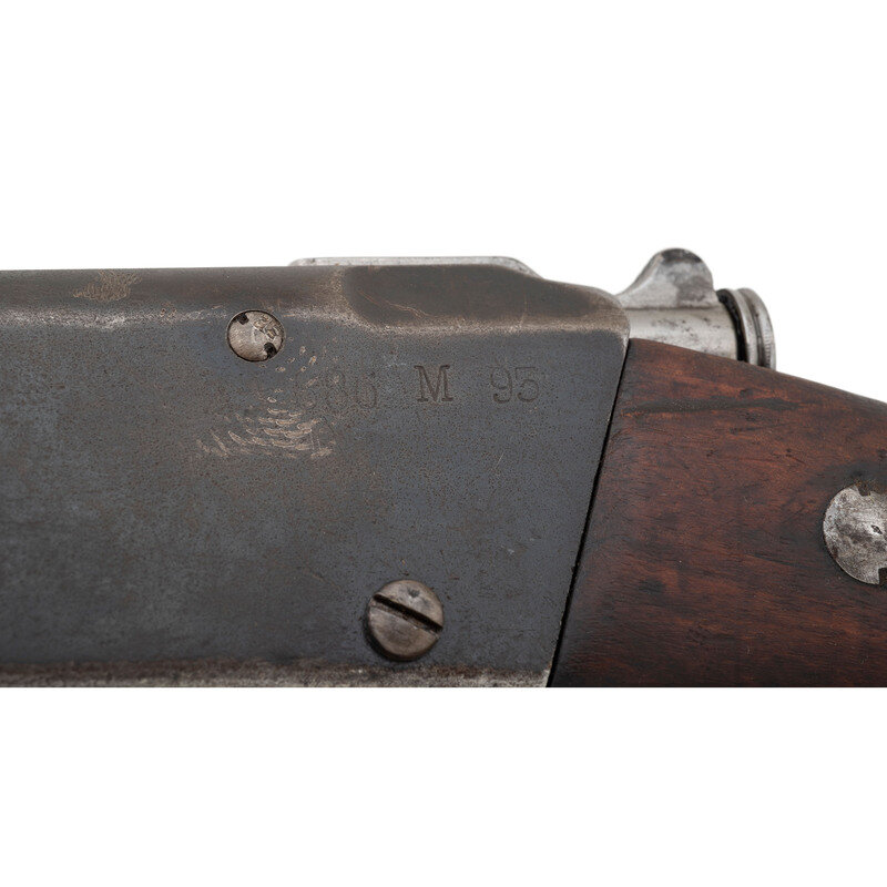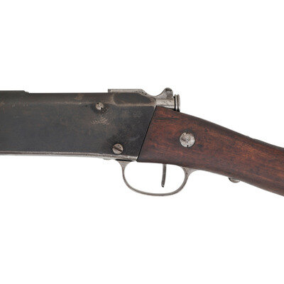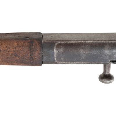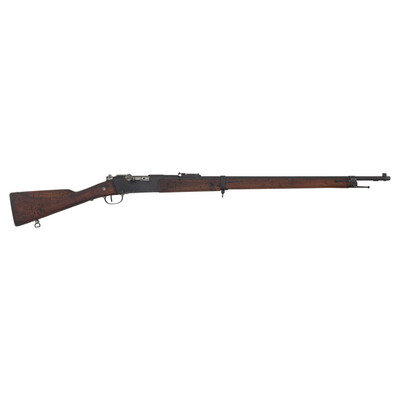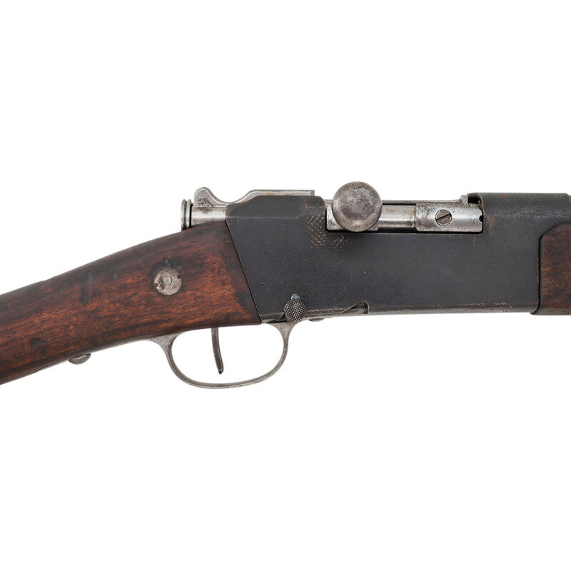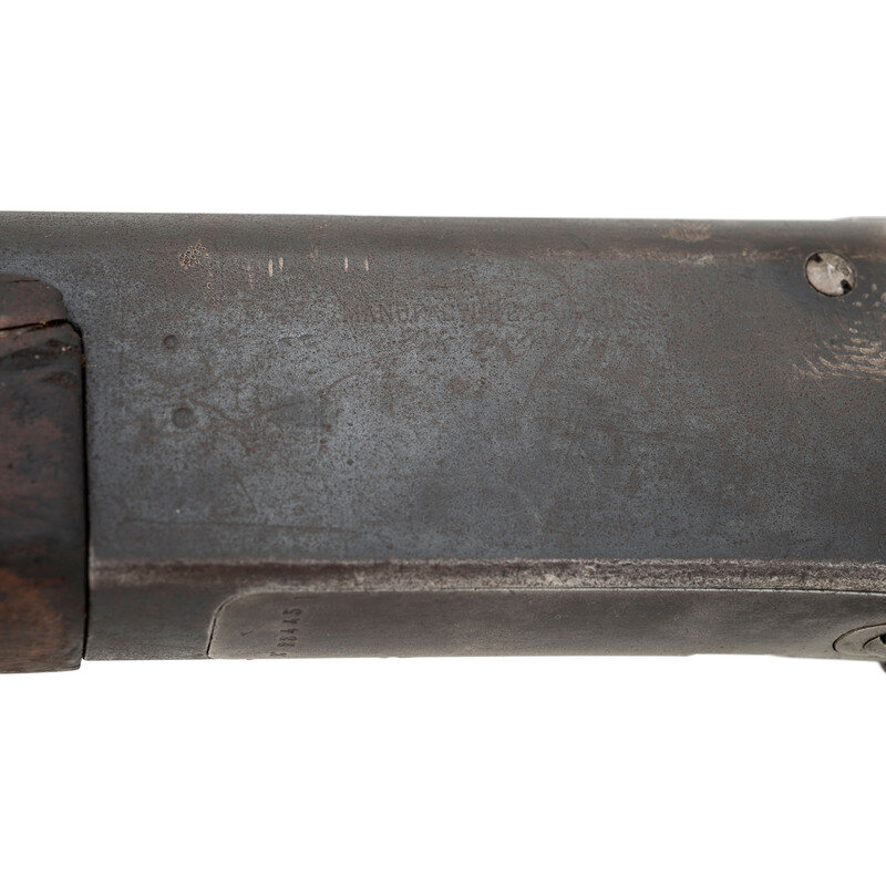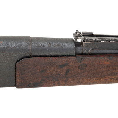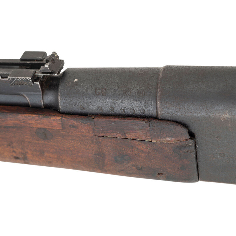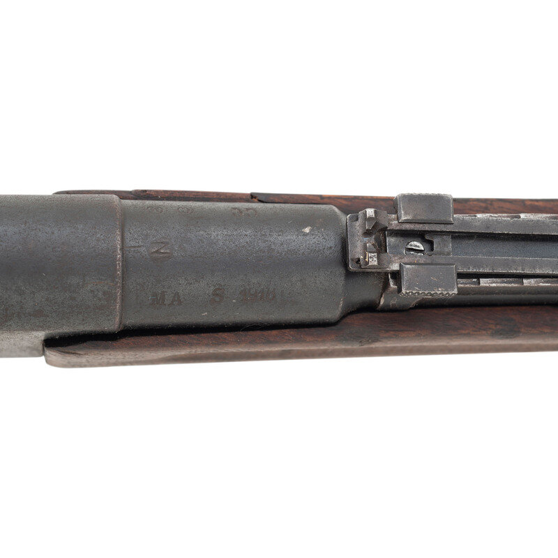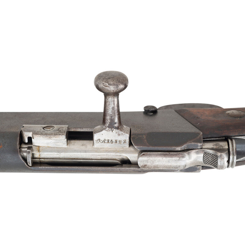 8x50R. 31.5" barrel. SN: g18900. Blued metal refinish with polished bolt set in walnut straight wrist stock and mounting adjustable rear ladder with front blade sights. Bolt action internal tube magazine fed repeating rifle charged with individual cartridges. Missing magazine follower. Original markings on the receiver are weak due to refinish with left receiver exhibiting a very faint MANUFACTURE D'ARMES/St Etienne followed by MLE 1886 M 93. Right barrel is struck MA S 1916. Serial numbers do not match.