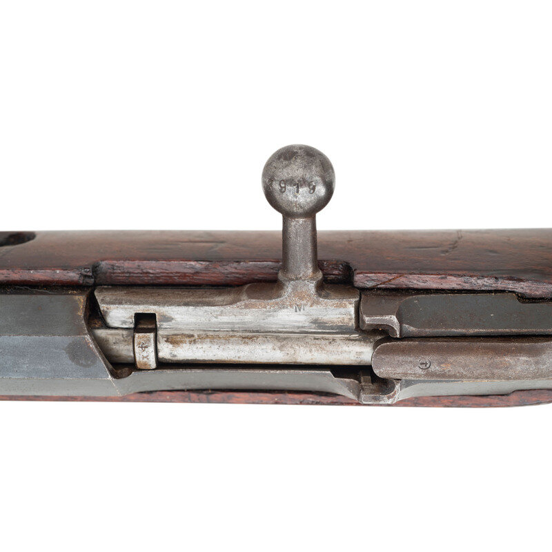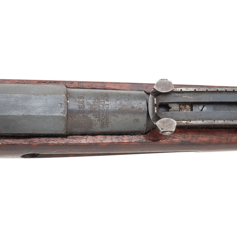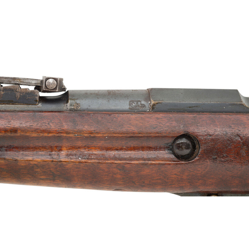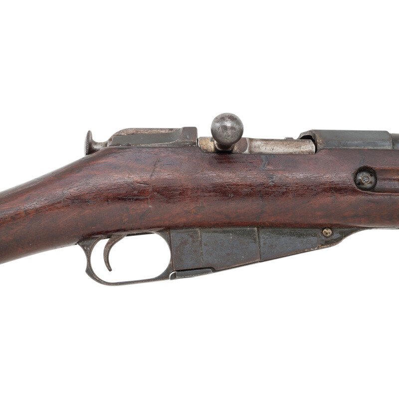 7.62x54R. 32.5" barrel. SN: 633919. Blued metal refinish with polished bolt set in a varnished straight wrist walnut stock. Bolt action internal magazine fed repeating rifle mounting adjustable rear ladder and front blade sights. Barrel shank is struck NEW ENGLAND/WESTINGHOUSE/COMPANY/1915 below the {Imperial Russian Eagle} stamp. Serial number to magazine floorplate does not match. Left side of the barrel displays the boxed SA mark, indicating it went through rebuild in Finland at some point. Original Russian arshin range marks on the left side of the rear sight base have been struck with equivalent mark in meters applied to the right side. Item shows scattered Russian arsenal markings to various parts. Importer mark to muzzle reads CAI ST A VT/M91 7.62R US.