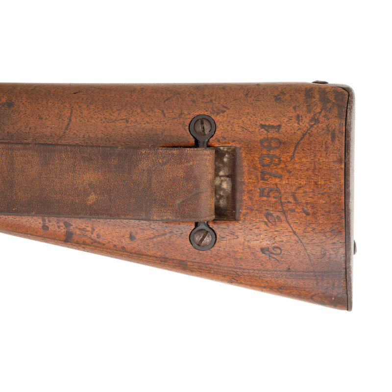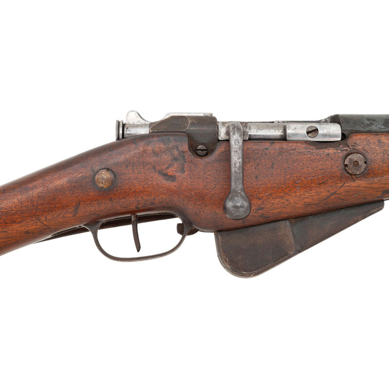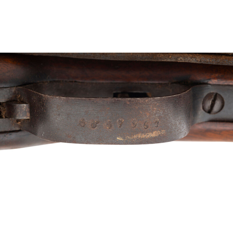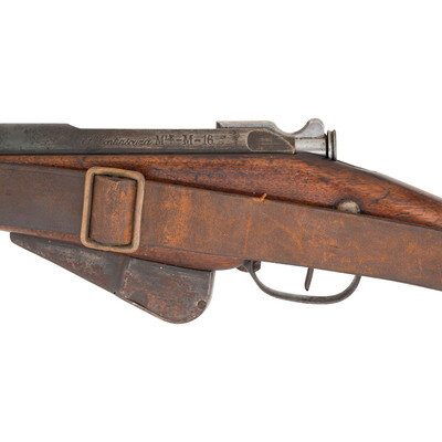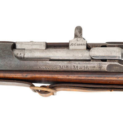8x50mmR. 18" barrel length. SN: AC57961. Blued metal finish with polished bolt in walnut straight wrist stock with half length upper handguard and finger grooves to forend. Bolt-action repeating rifle fed by an internal box magazine charged with Mannlicher pattern en-bloc clips. Left receiver is marked Etts Continsouza MLE-M-16. indicating it was made by one of the civilian subcontractors, Etablissement Continsouza. Cartouche to right stock is illegible. Serial numbers match on the stock, triggerguard, and bolt. Item comes with a cleaning rod and a leather sling.