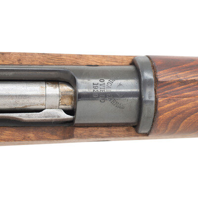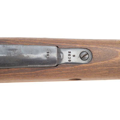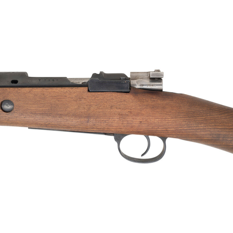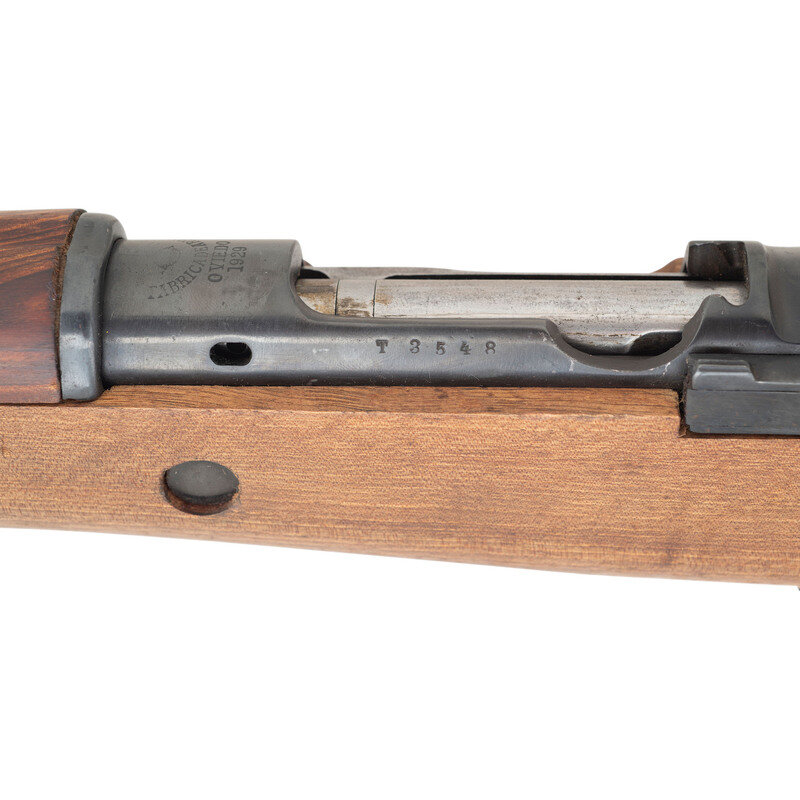 7x57mm. 21.5" barrel length. SN: T3548. Blued metal finish with polished steel bolt. Walnut stock has a plain straight grip and forearm, with handguard. Bolt action rifle with adjustable tangent notch rear sight and blade front sight with ear protector lug. Item features an internal magazine, double side sling loops, bayonet lug forend, and a slotted head cleaning rod. Markings include Spanish Oviedo crest over a 1929 date to receiver.