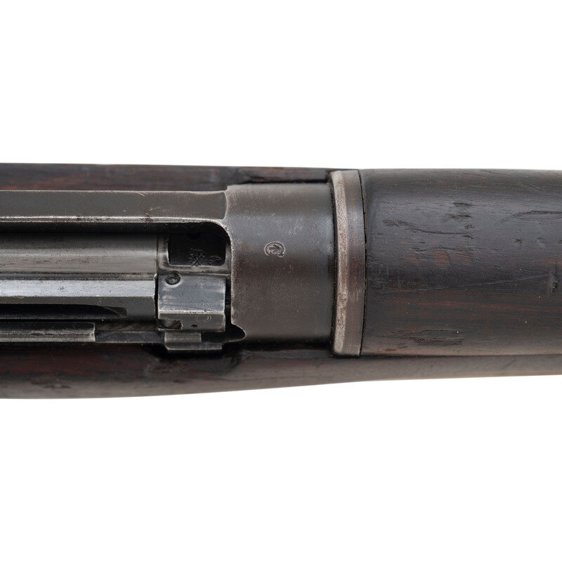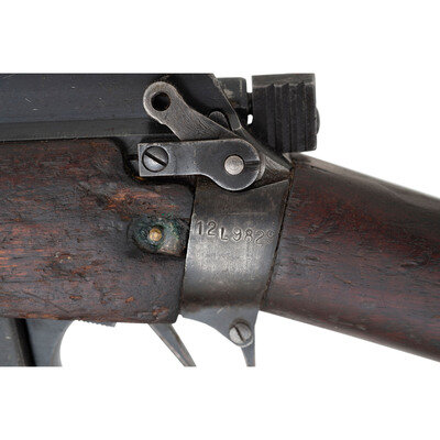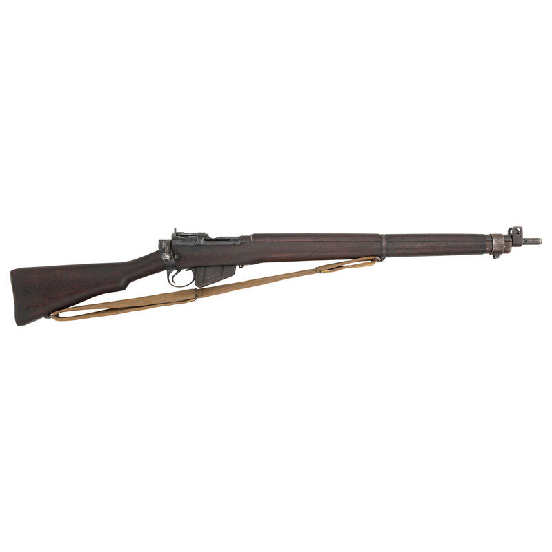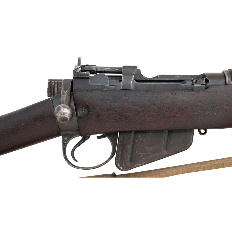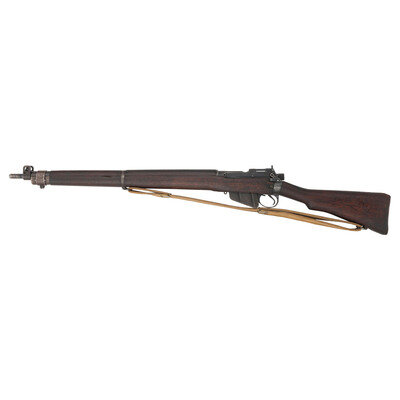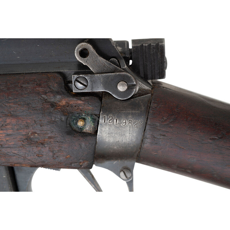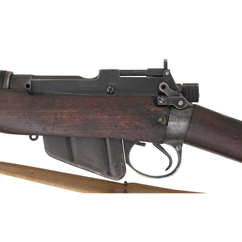 .303 British. 25" barrel length. SN: 12L9829. Parkerized military finish. Semi pistol grip walnut stock with handguard. Bolt action rifle with a Mk.III adjustable folding rear peep sight and blade front sight with ear protectors. Item features a removable magazine, double sling swivels, bayonet lug muzzle, and a trapdoor buttplate void of contents. Markings include NO.4 MK.I*/LONGBRANCH/1945 to left of receiver, along with a British proof to receiver, and importer marks under muzzle. Includes a khaki web sling.