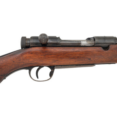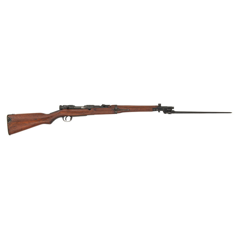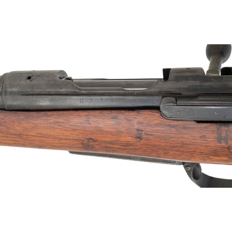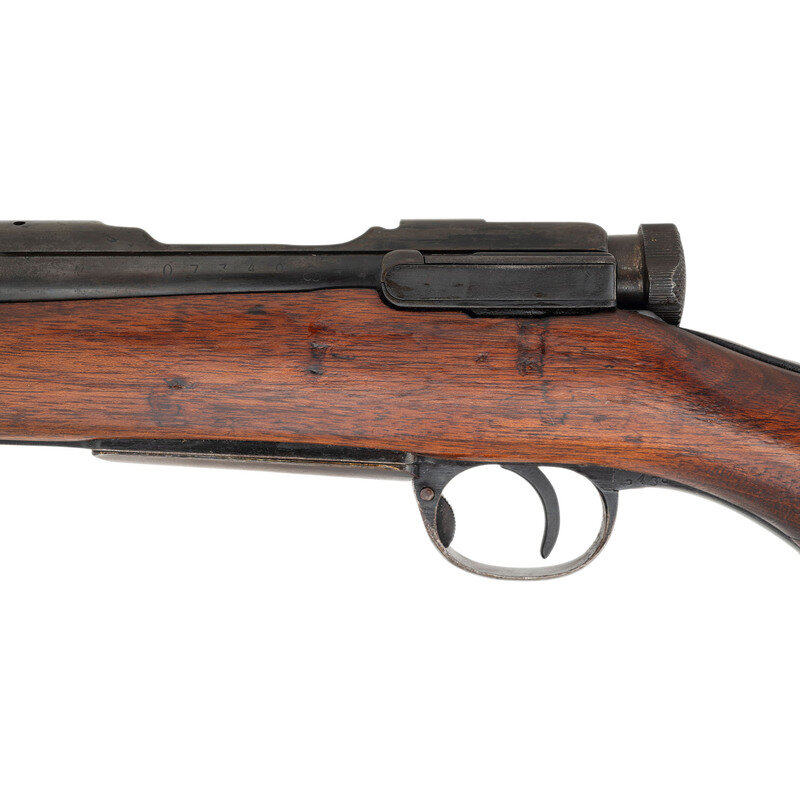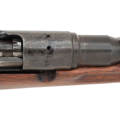 6.5x50mm. 19.2" barrel length. SN: 07340. Blued metal refinish with full length wood semi-pistol grip stock with spliced toe and featuring an under-folding triangular spike-bayonet. Bolt-action repeating rifle fed by an internal box magazine charged with stripper clips. Item features an adjustable rear ladder notch and barleycorn front blade sight with protectors. Receiver shows weak type markings indicating it has been refinished, along with a ground chrysanthemum. Left receiver shows the stacked cannonball logo of the {Koshikawa Arsenal}. Stock port for the cleaning kit is a single hole, consistent with the Third Variation Type 44s, along with the shortened and strengthened bayonet lug. Serial numbers do not match, and the bolt lacks a visible serial number.