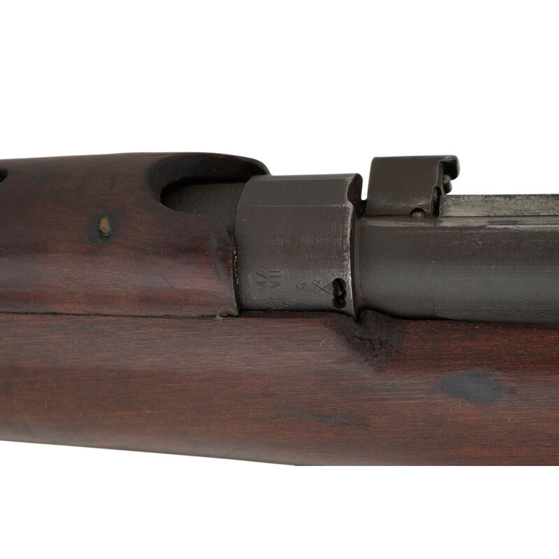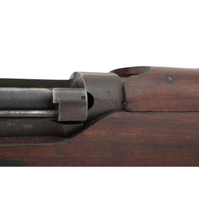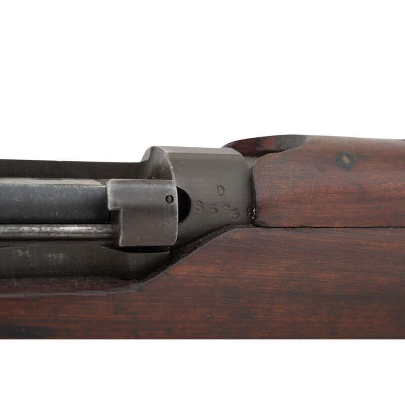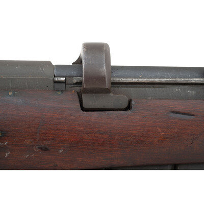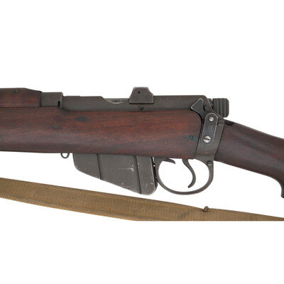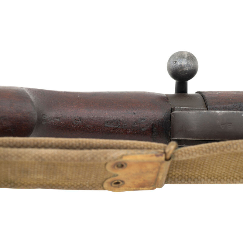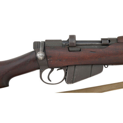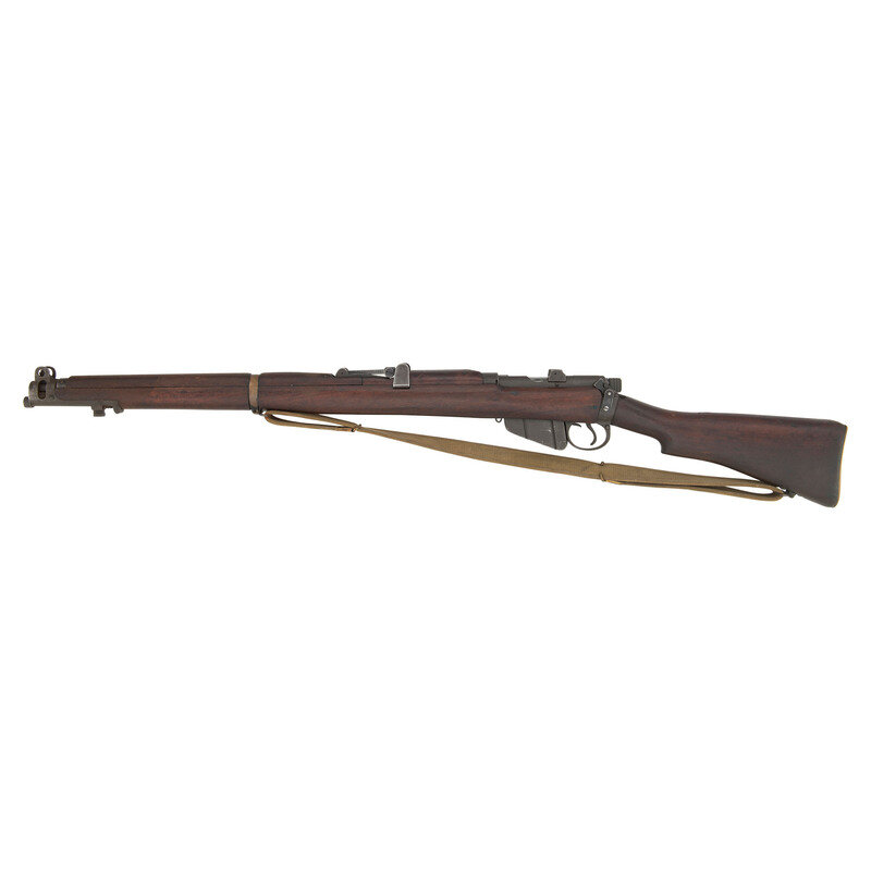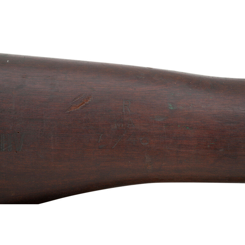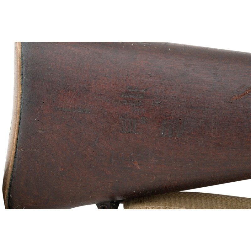 .303 British. 25.2" barrel length. SN: D86838. Parkerized metal refinish overall with walnut semi-pistol grip stock with full length upper handguard and brass buttplate. Bolt-action semi-detachable magazine fed repeating rifle mounting adjustable rear notch and front blade sights with protectors. Right side of the stock ring is marked MA/LITHGOW/SMLE/III*/1942 with further inspection marks struck on the receiver ring including the Australian {Crown/Crossed Flags/L} and an MA marking. Bayonet lug, barrel band, trigger, and triggerguard are stamped BA. Buttplate, rear sight protector, and leaf are struck OA with the latter additionally marked 43. Right stock has been struck with armorer marking R/MA/7/46. Right butt further marked with MA factory marking followed by III* HV/1942 mark. Importer mark to right receiver reads JJCO/NY NY .303 B. Comes with an unmarked British pattern khaki canvas sling.