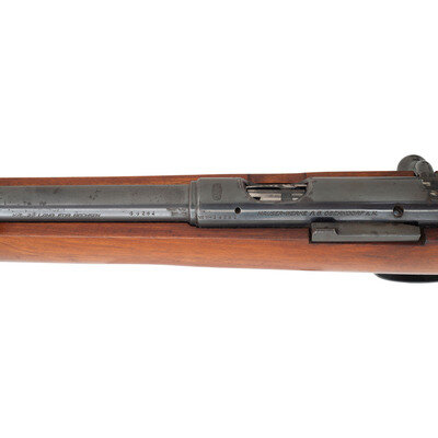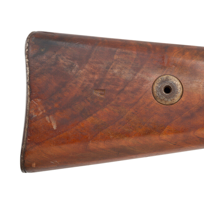 .22 LR. 26" barrel length. SN: 36262. Blued metal finish. Semi pistol grip walnut stock with handguard and a Duffel cut to forend under barrel band. Single shot bolt action rifle with an adjustable tangent notch rear sight and blade front sight. Item features side sling loops, stock takedown discs, and a faux cleaning rod forend. Markings include Mauser banner to receiver, other Mauser manufacturer marks, and German proofs. Stock is marked with a P on right side of butt.