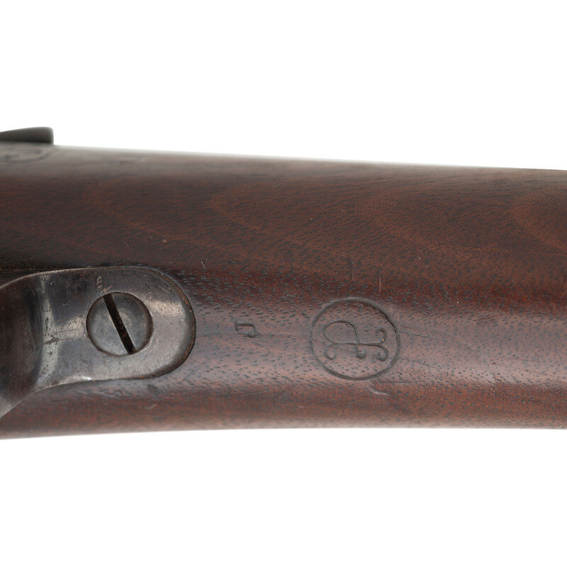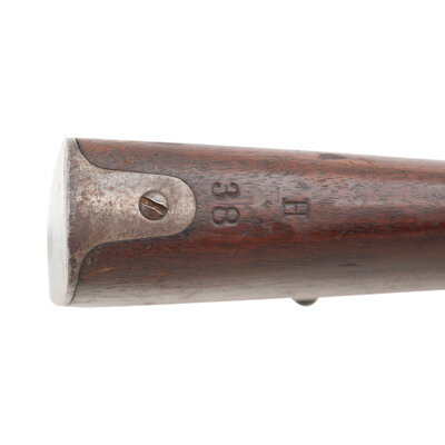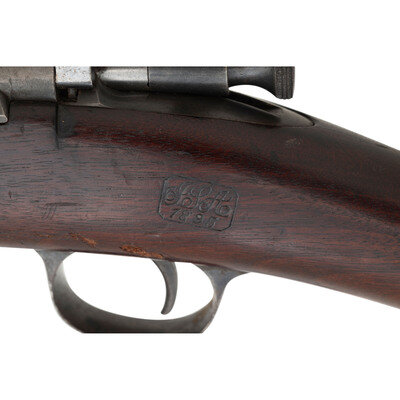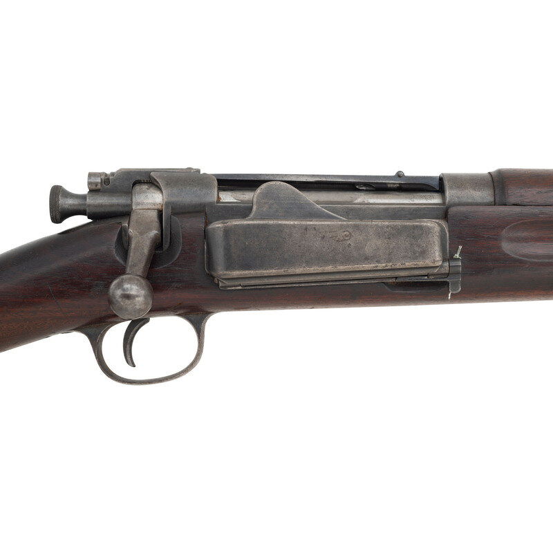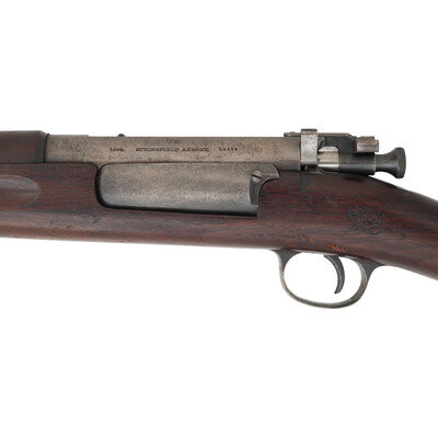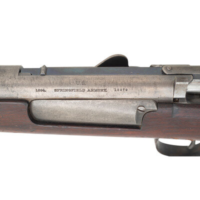 .30-40 Krag. 30" barrel length. SN: 13679. Blued metal finish with case hardened receiver. Walnut stock has a plain straight grip and forearm, with grasping grooves and handguard. Bolt action rifle with M1896 adjustable folding ladder notch rear sight and pinned blade front sight. Item features an integrated magazine, triple stacking swivels, a bayonet lug forend, and trapdoor buttplate void of contents. Markings include U.S./1894 SPRINGFIELD ARMORY 13679 to receiver. Stock is marked with a boxed JSA/1895 Joseph S. Adams inspector cartouche on left side, circle P proof to bottom of grip, and H/38 to comb.