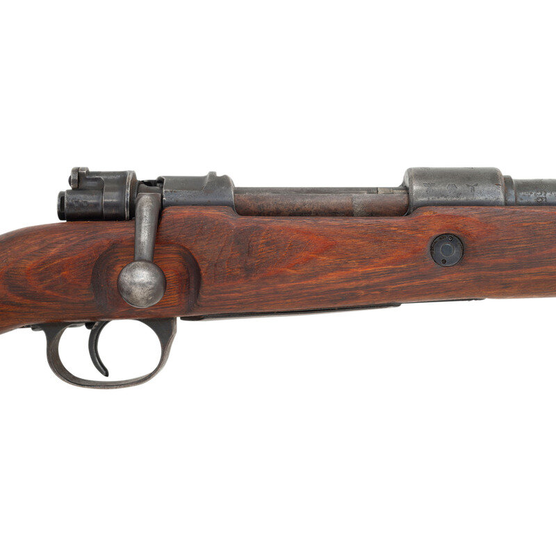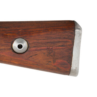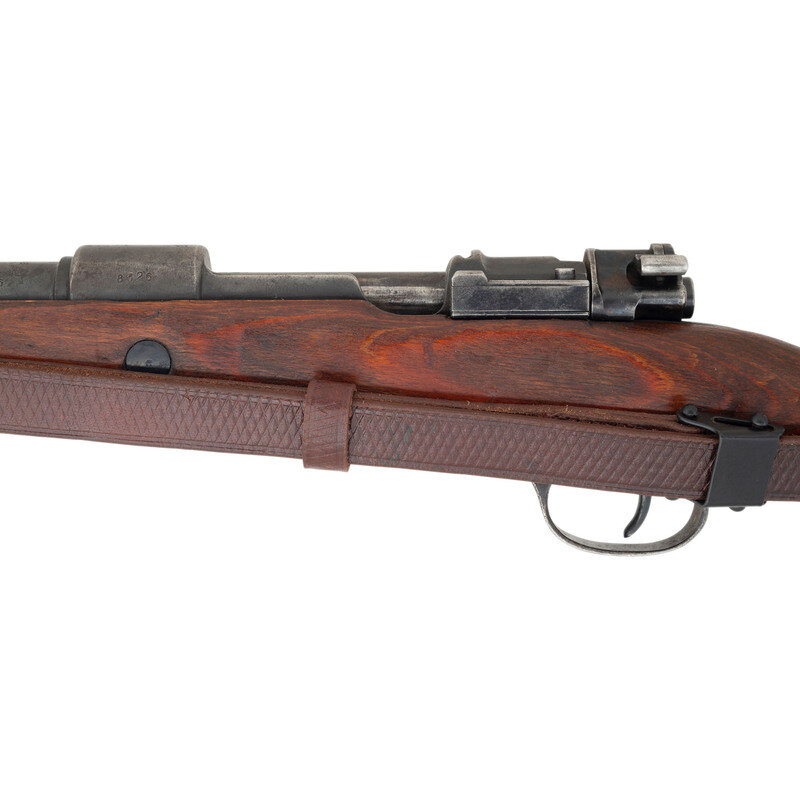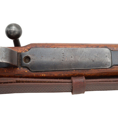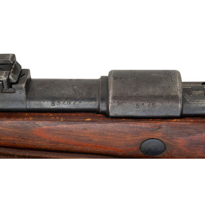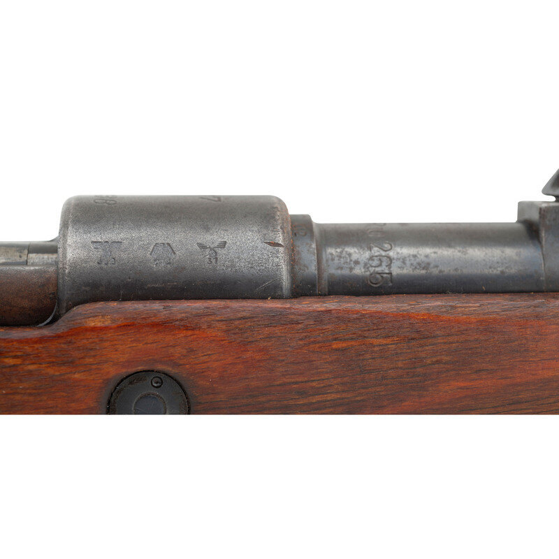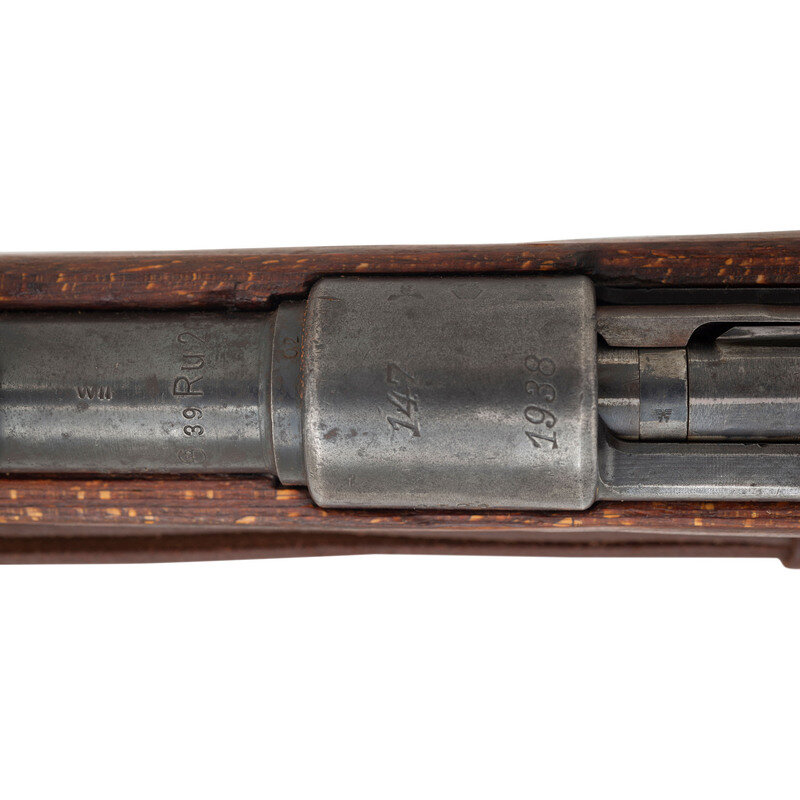 8mm Mauser. 24.5" barrel length. SN: 8326. Blued metal finish. Semi pistol grip walnut stock with handguard. Bolt action rifle with an adjustable tangent notch rear sight and blade front sight. Item features an internal magazine, side mounted sling loops, bayonet lug forend, cupped steel buttplate, and stock disc. Markings include 147/1938 to receiver and 39Ru265 to barrel. Receiver is also marked with eagle/359, eagle/214, and eagle/37 marks to right side. Bolt is marked with an eagle/77 mark. Stock is marked N765 on left side. Includes slotted head cleaning rod and a brown leather sling.