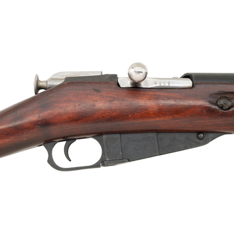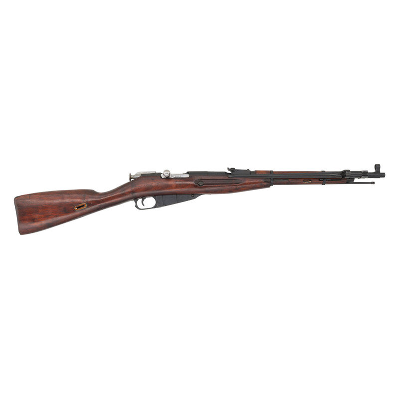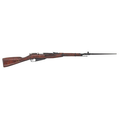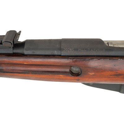 7.62x54mmR. 20.5" barrel length. SN: 20285. Blued military finish. Straight grip hardwood stock with grasping grooves and handguard. Bolt action rifle has an adjustable tangent notch rear sight and globe post front sight. Item features an integrated magazine, fixed spike bayonet, sling slots, and double barrel bands. Markings include a 1944 date to receiver, Izhevsk arsenal mark, various Soviet proofs, and import marks to receiver.