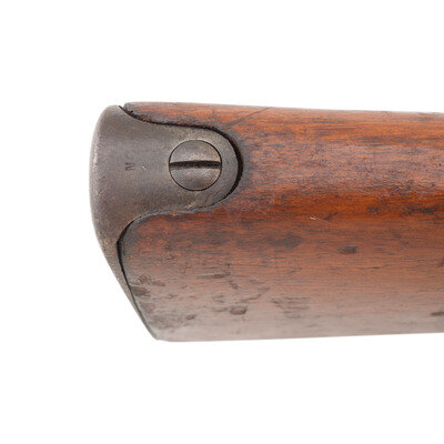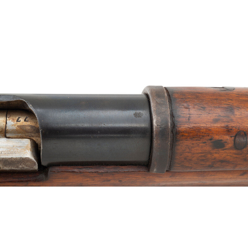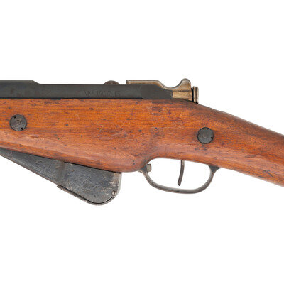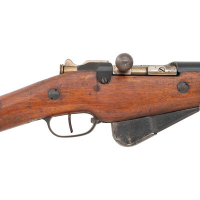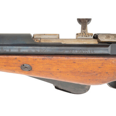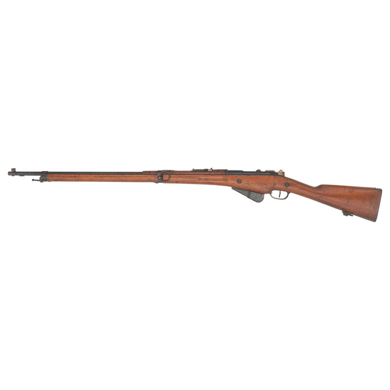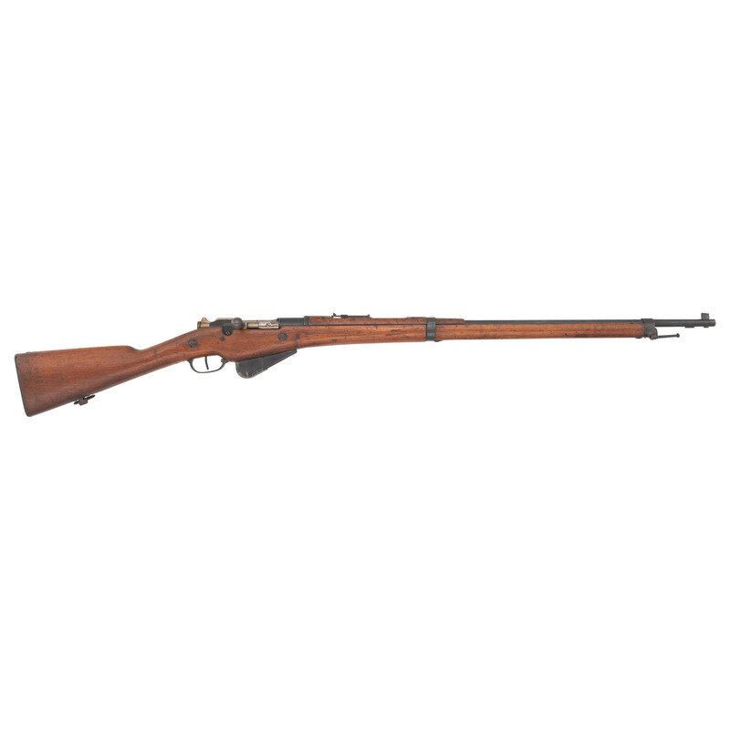 8x50mmR Lebel. 31.5" barrel length. SN: 86307. Blued metal finish. Walnut stock has a plain straight grip and forearm, with grasping grooves and handguard. Bolt action rifle with adjustable folding ladder notch rear sight and notch front sight. Item features an integrated magazine, double sling swivels, parry hook, and bayonet lugs to bottom of barrel. Markings include Chatellerault Mle. 1907-15 to left side of receiver.