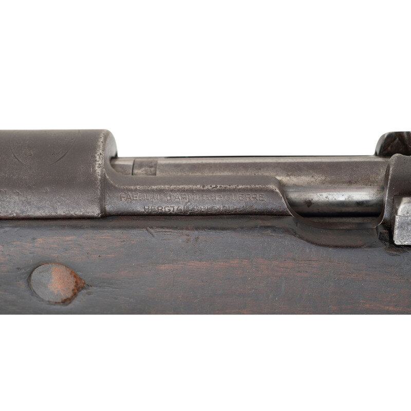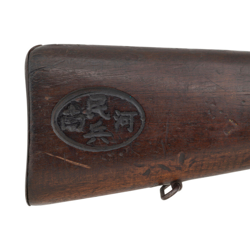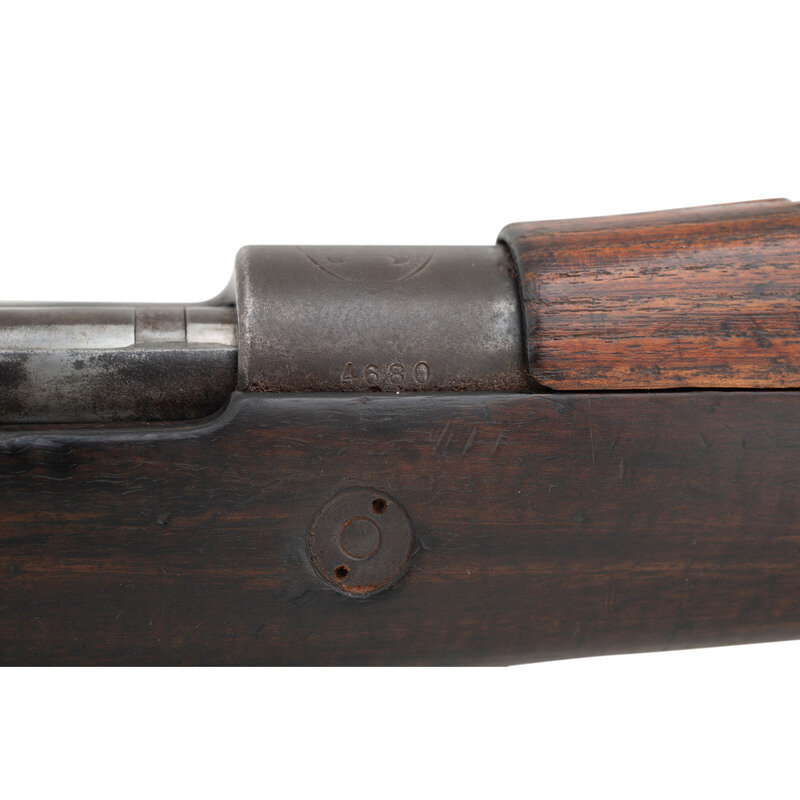 7.92x57mm Mauser. 23.5" barrel length. SN: 4680. Blued metal finish. Walnut stock has a plain rounded semi pistol grip and forearm, with handguard and single barrel band. Bolt action rifle with a tangent notch rear sight and blade front sight. Item features an internal magazine, bayonet lug forend, and double sling swivels. Markings include FN manufacturer marks to receiver. Stock is marked with an ovular cartouche that shows four Chinese characters on right side of butt.