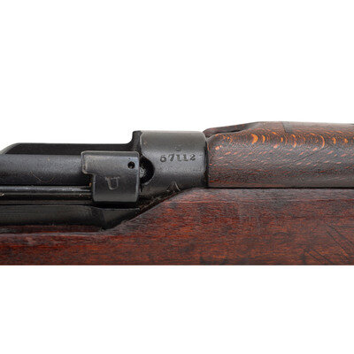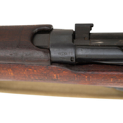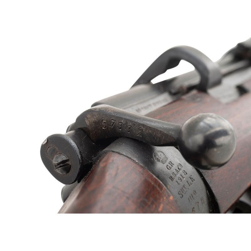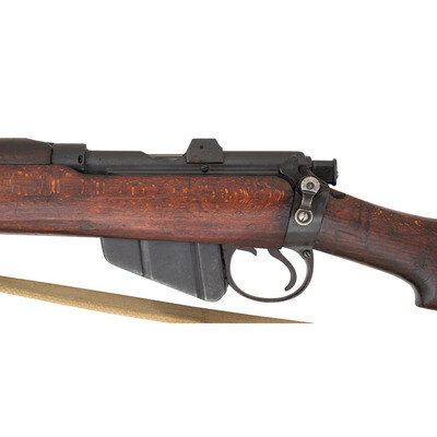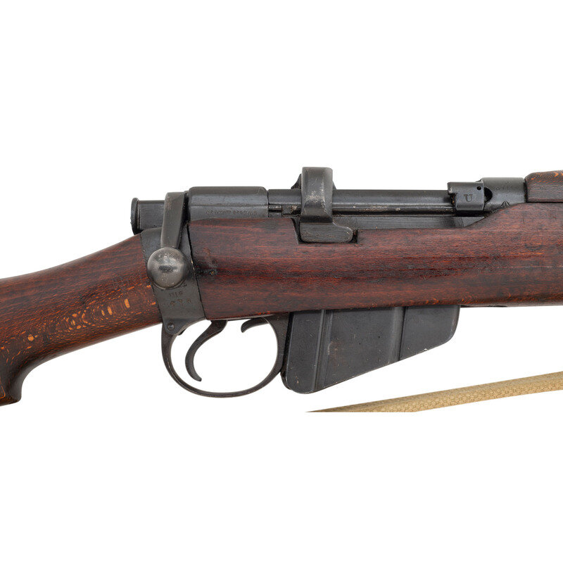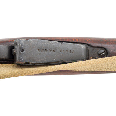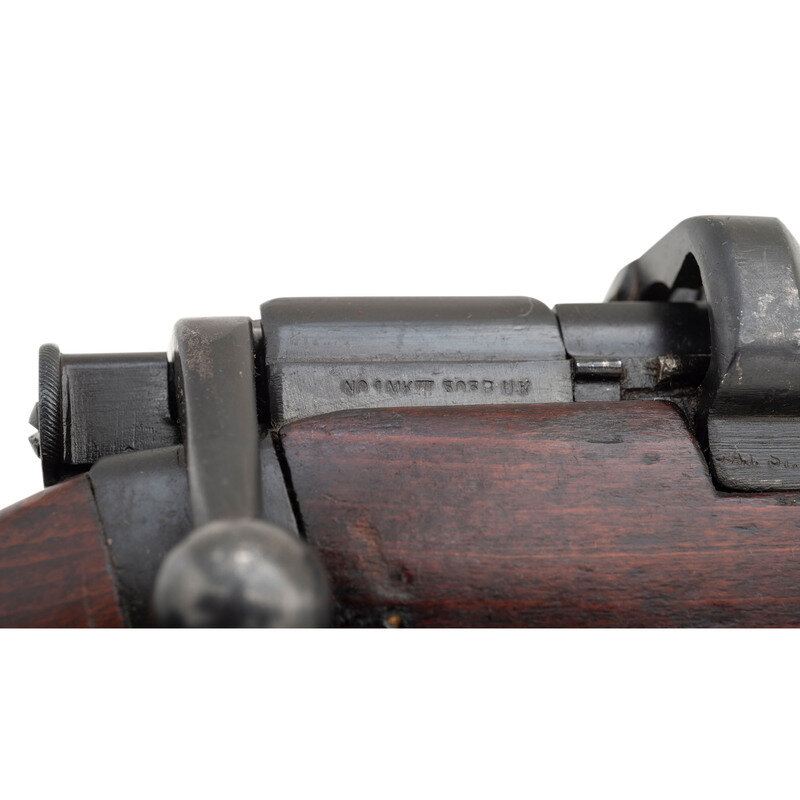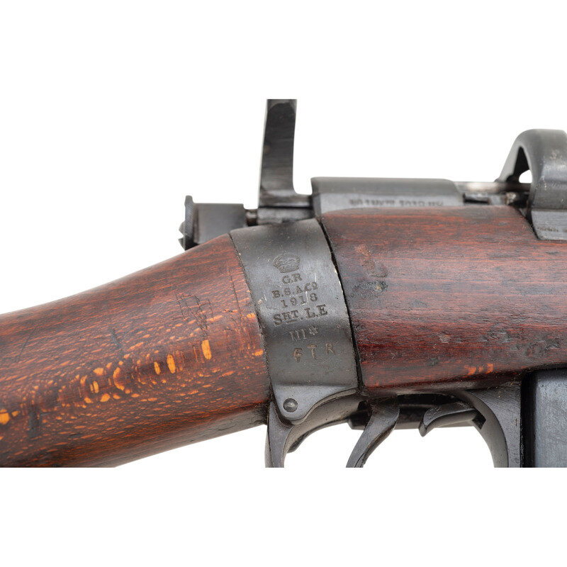 .303 British. 25" barrel length. SN: J57112. Black Suncorite finish. Walnut stock has a plain semi pistol grip and forearm, with handguards. Bolt action rifle with adjustable tangent notch rear sight and blade front sight with ear protectors. Item features a removable magazine, double sling swivels, bayonet lug forend, and a trapdoor brass buttplate void of contents. Markings include BSA Co./1918 marks to wrist band, various British proofs, and importer marks to receiver. Includes a khaki sling.
