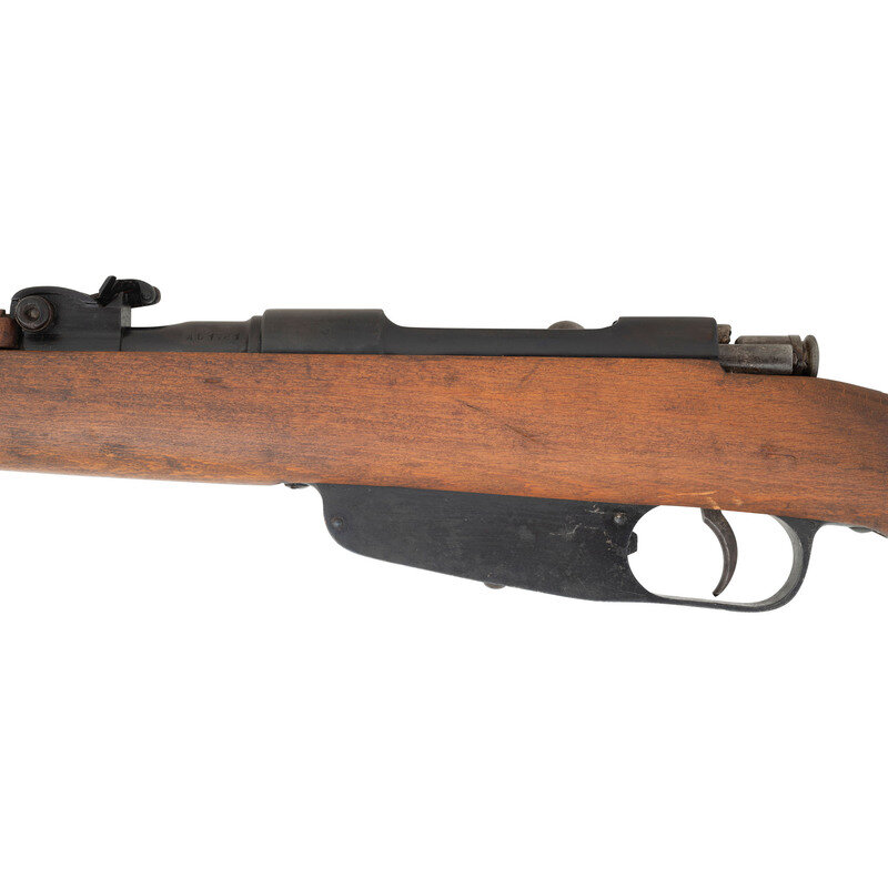 6.5x52mm Carcano. 26.25" barrel length. SN: AG1781. Blued metal finish. Walnut stock has a plain straight grip and forearm, with handguard. Bolt action rifle with an adjustable notch rear sight and blade front sight. Item features an integrated magazine, quad sling loops, bayonet lug forend, and a slotted head cleaning rod. Markings include boxed {crown}/FAT/1942 marks in front of receiver. Stock is marked MADE IN ITALY.