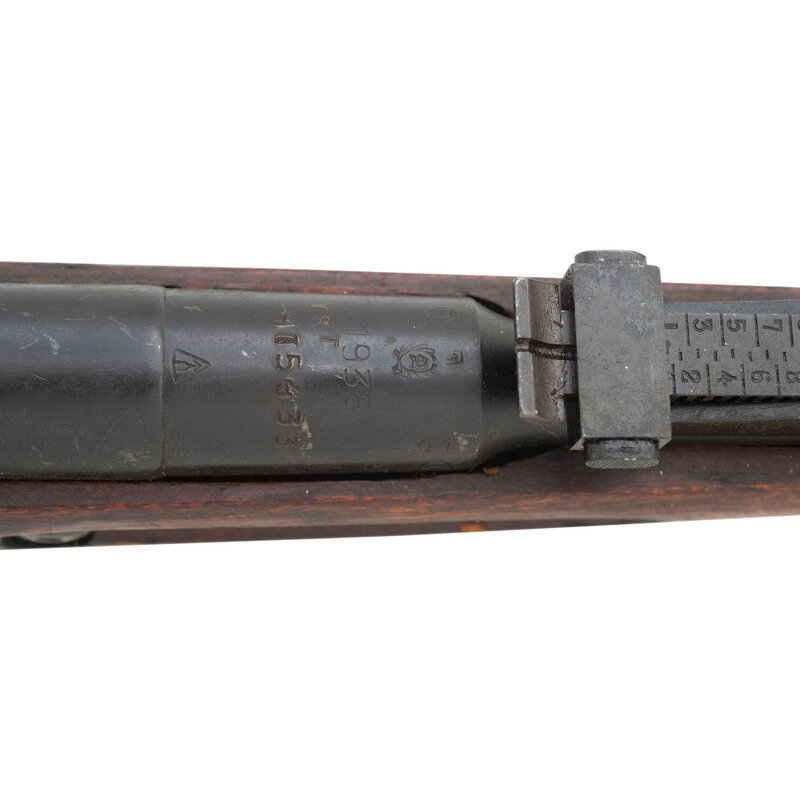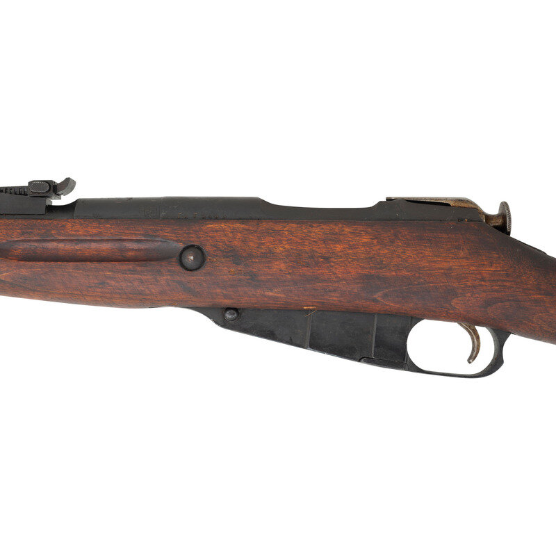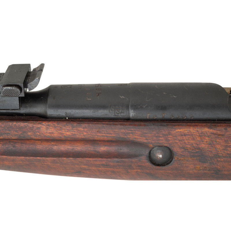 7.62x54mmR. 30" barrel length. SN: TST5433. Parkerized metal finish. Hardwood stock has a plain straight grip and forearm, with grasping grooves and handguard. Bolt action rifle with adjustable tangent notch rear sight and blade front sight. Item features an integrated magazine, double sling slots with dog collar leather loops, and a slotted head cleaning rod. Markings include Izhevsk arsenal marks, a 1938 date, and double stamped boxed SA Finnish Army markings. Barrel is also marked with CAI importer marks. Stock has a weak cartouche to right side of butt.