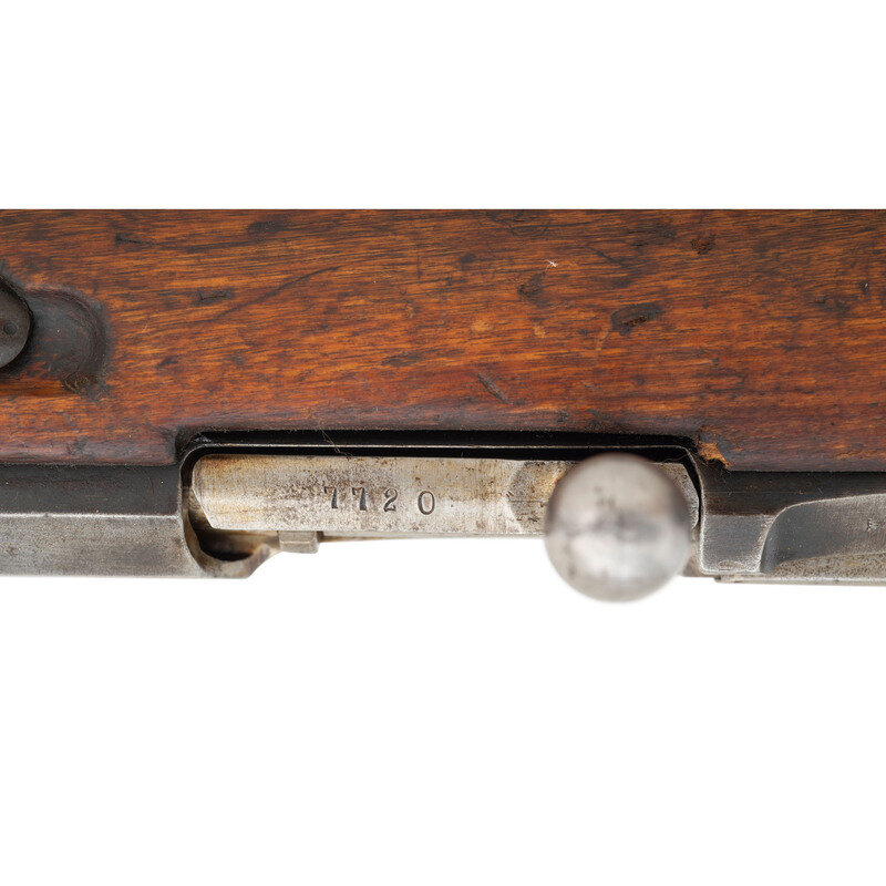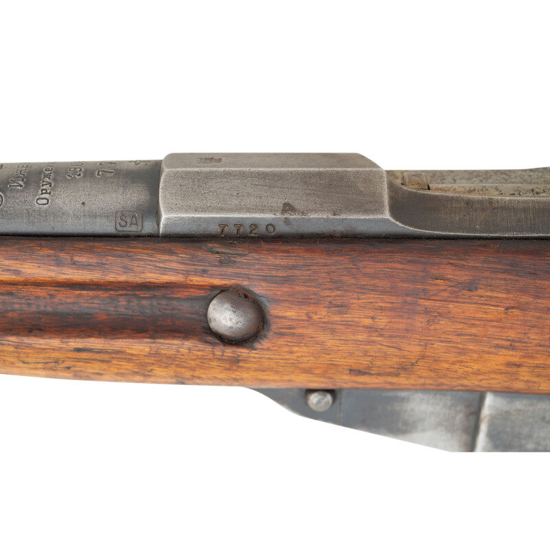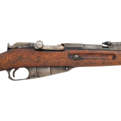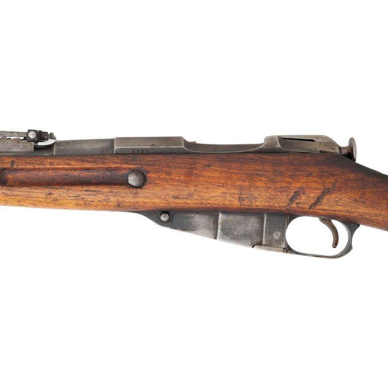 7.62x54mmR. 31.5" barrel length. SN: 7720. Blued metal finish, with polished steel bolt. Hardwood stock has a plain straight grip and forearm, with grasping grooves. Bolt action rifle with an adjustable tangent notch M1908 rear sight and barleycorn blade front sight. Item features a hexagonal receiver, double sling swivels, integrated magazine, and a slotted head cleaning rod. Markings include Imperial Russian marks, Izhevsk arsenal marks to receiver above a 1906 date, and a boxed SA Finnish proof to left side of barrel. Barrel is marked with CAI import marks on right side of muzzle.